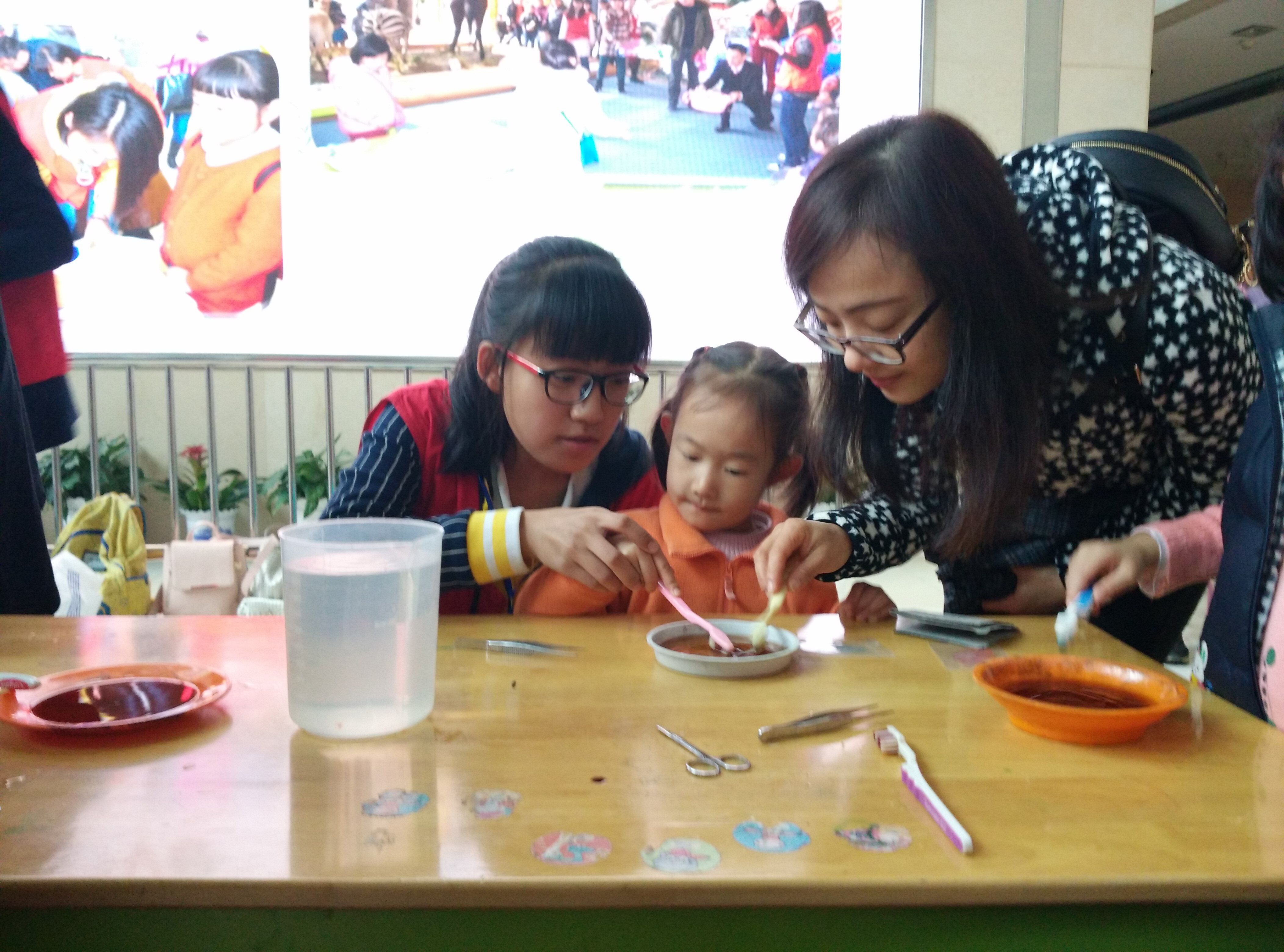 上午九点半,由B.D.服务社招募的志愿者进入自然博物馆大厅开始筹备与布置活动现场,搬放桌子椅子、张贴海报、叶脉书签所需材料的摆放等,志愿者们都精心地完成了每一项准备工作。上午十点半,活动正式开始。小朋友们对制作叶脉书签极大的兴趣让博物馆大厅洋溢着求知与动手的热情,整个活动现场气氛活跃,陆续吸引了许多亲子家庭来参与活动。制作的第一个步骤是用牙刷将煮过的叶子的叶肉敲掉,直至叶片通透叶脉清晰为止。该步骤所需时间相对较长,但小朋友们仍然十分耐心与小心翼翼地进行着第一道工序,最后取得了令人满意的效果。接下来,小朋友可以根据自己喜好挑选染色的颜色,叶子在墨水里涮过一遍以后用餐巾纸吸干叶子的水分。吸干后放入准备好的塑纸,最后用塑封机封,就这样一片完整的叶脉书签成形了。小朋友们拿到美丽的叶脉书签的时都迫不及待地和家长分享完成一片叶脉书签的喜悦之情,并且进行了拍照留念。活动进行到下午一点二十,志愿者们带着满心的欢喜离开了浙江自然博物馆。