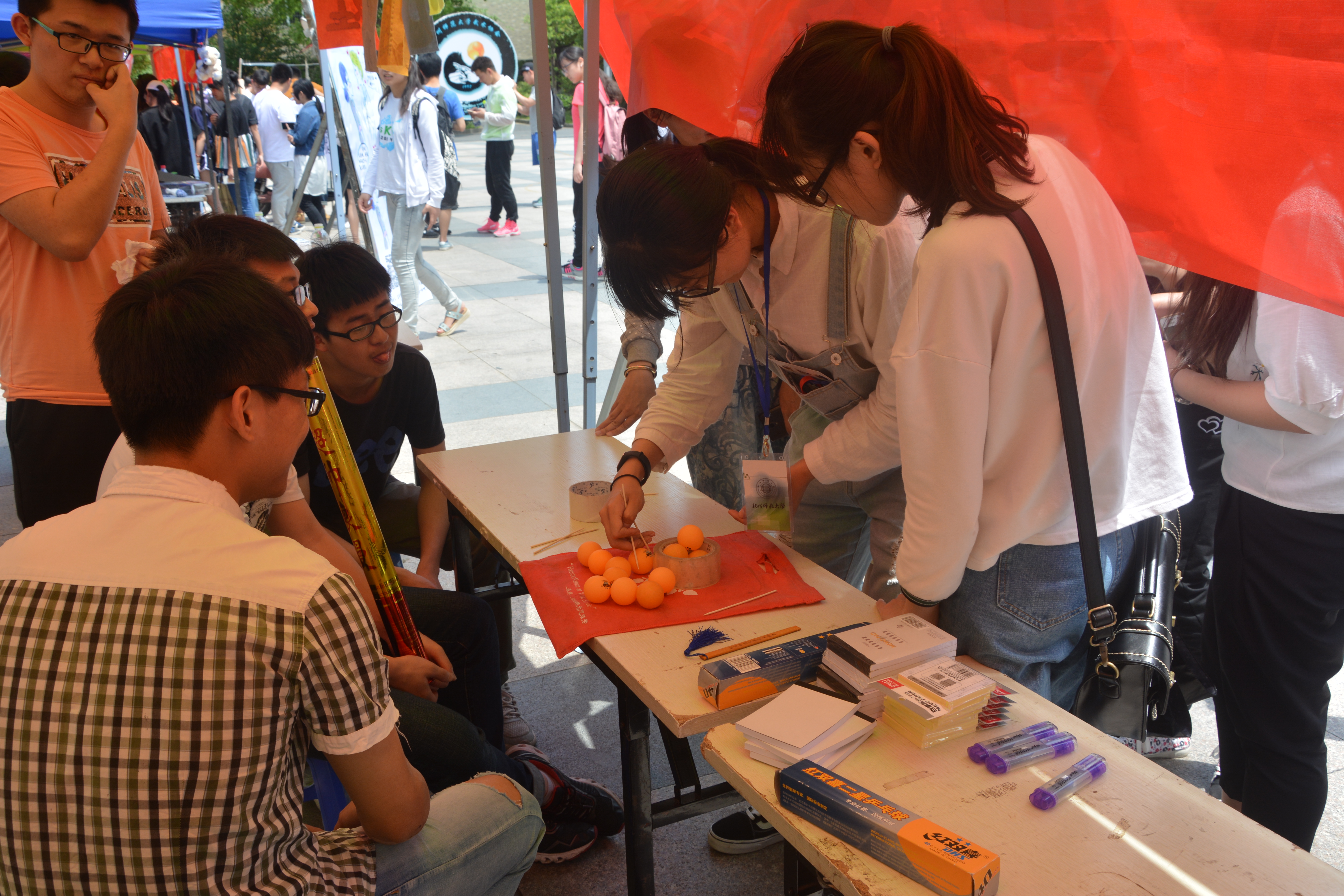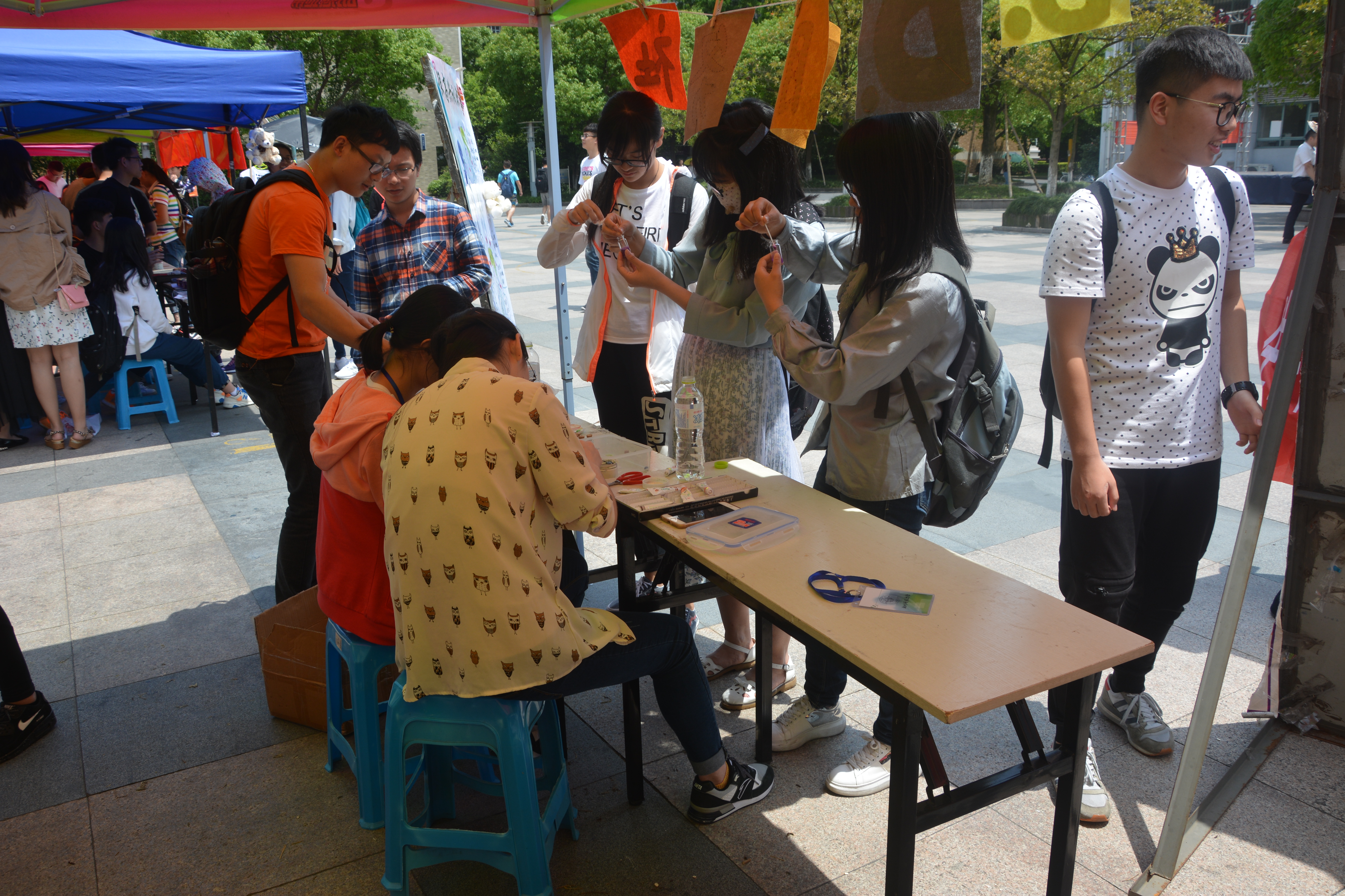 本次社团巡展的活动安排精简务实,内容新意百出,参与人数众多,气氛热闹非凡。野百合艺术团的“袜子涂鸦”给同学们提供了一个激发想象力,展现创造力的平台,同学们在袜子上发挥天马行空的想象,画下自己喜欢的图案,留作纪念。"绿之翼"环保协会的“跳格子”游戏同样引起了同学们极大的兴趣,同学们在游戏中收获了乐趣和奖品。贝斯特乒乓球协会的“叠乒乓球”考验的是同学们的耐心和细心,同学们全然不顾炎炎烈日,纷纷跃跃欲试,参与者全神贯注,周围的同学也都暗暗加油。B.D.服务社的“星云瓶制作”和“驱蚊包制作”云集了广大动手能力不俗的同学,一个个小小的星云瓶和驱蚊包无不体现同学们的自主创造力。而“生命缘”青年志愿者协会的“为你眼前一亮”活动体现了这个社团一贯的志愿服务精神,为同学们免费清洗眼镜,展现了生科院学生志愿者乐于助人的风貌。除了各社团别出心裁的节目之外,活动现场更有套着熊本熊玩偶服装的社团工作人员在宣传助兴,那憨态可掬的模样吸引了周围同学的目光,将现场的氛围推向高潮。