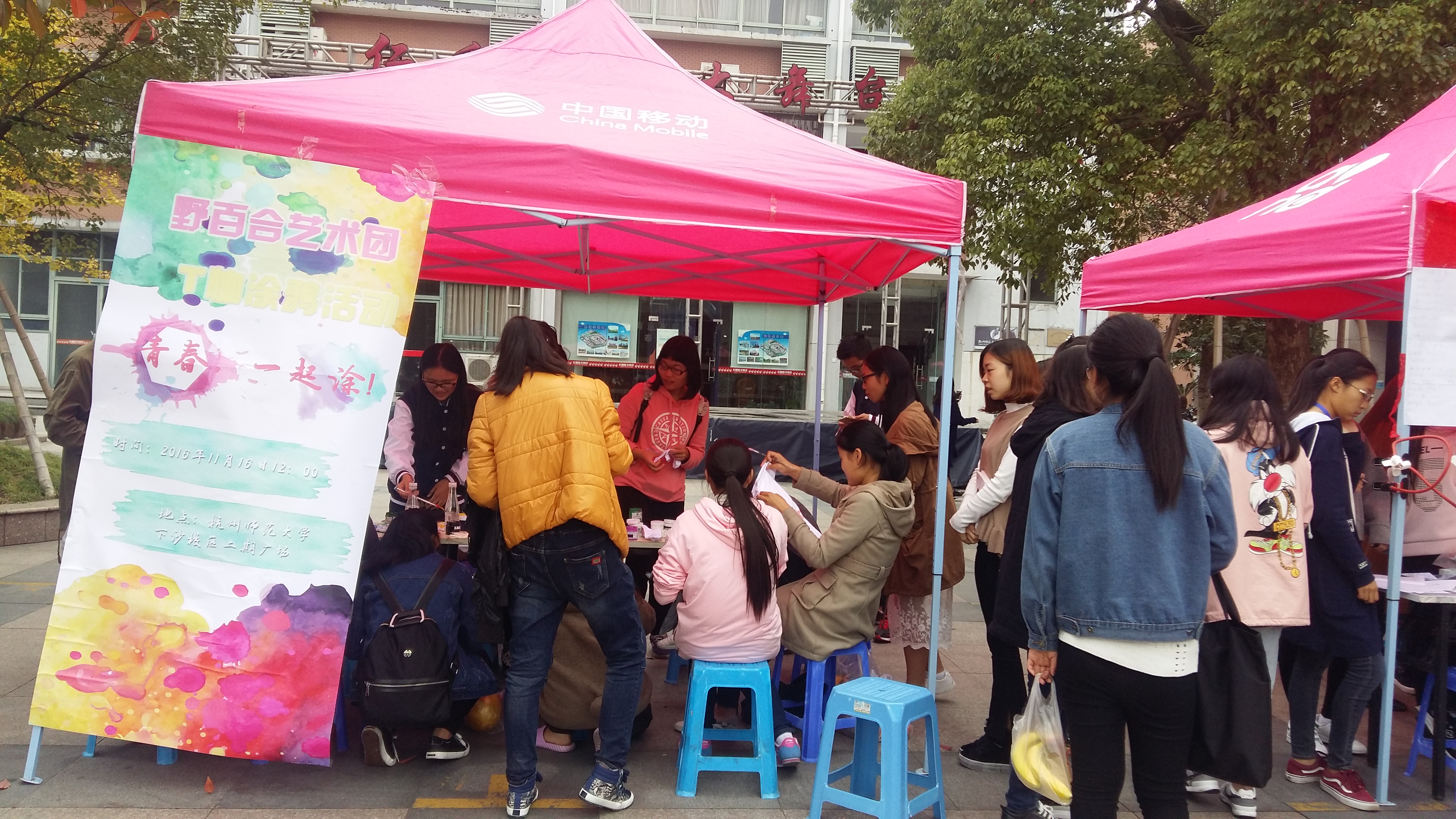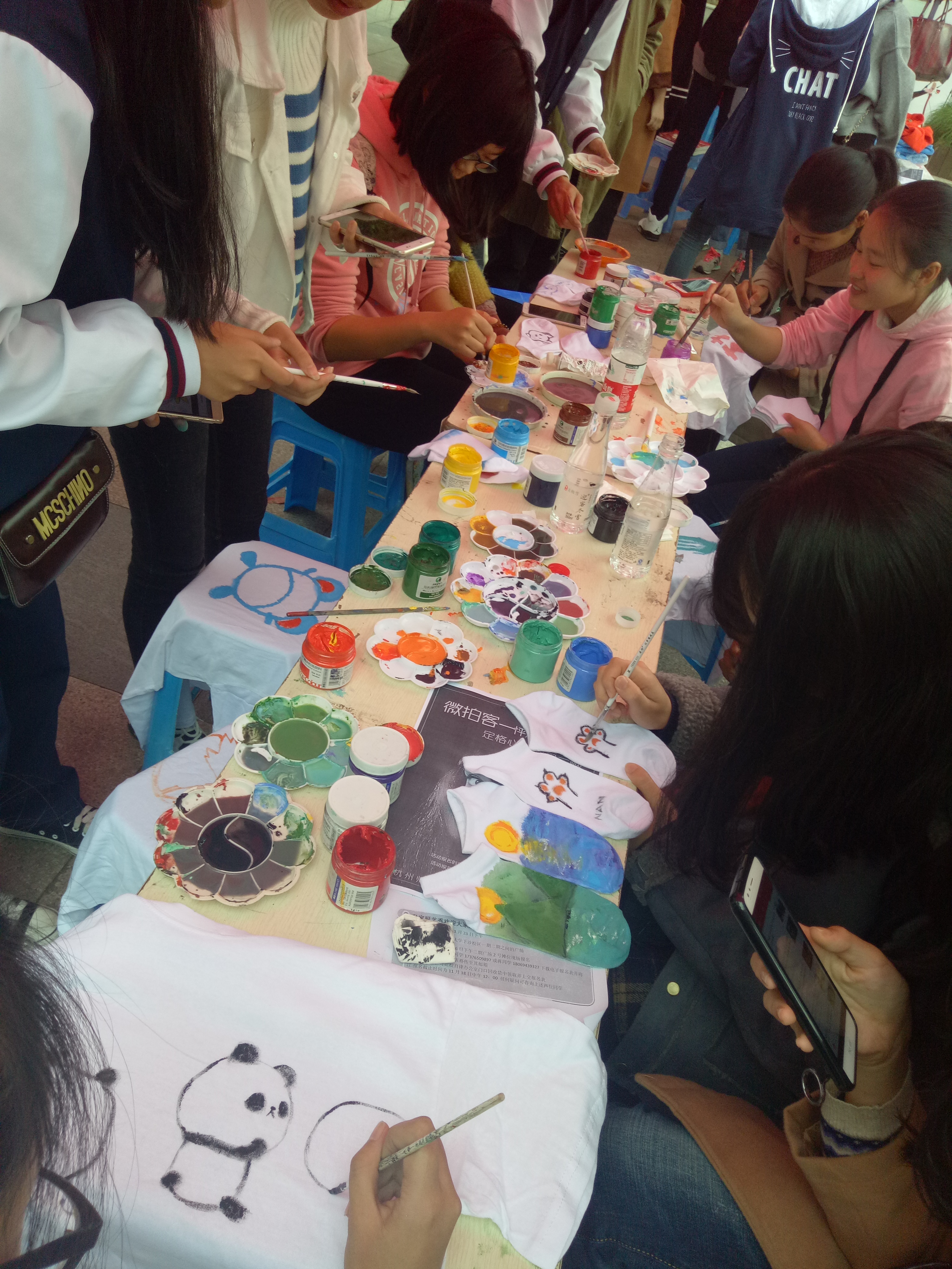 在活动当天,野百合的两位团长和小干事们也是早早来到了现场,对场地进行了初步的布置。海报在场地前支起来,各色颜料在桌子上一字排开,凳子整齐的在桌前排列,刚准备好,就引来了同学们的围观。看着绚烂多彩的颜料,干净纯粹的白T恤,很多同学都跃跃欲试啊。