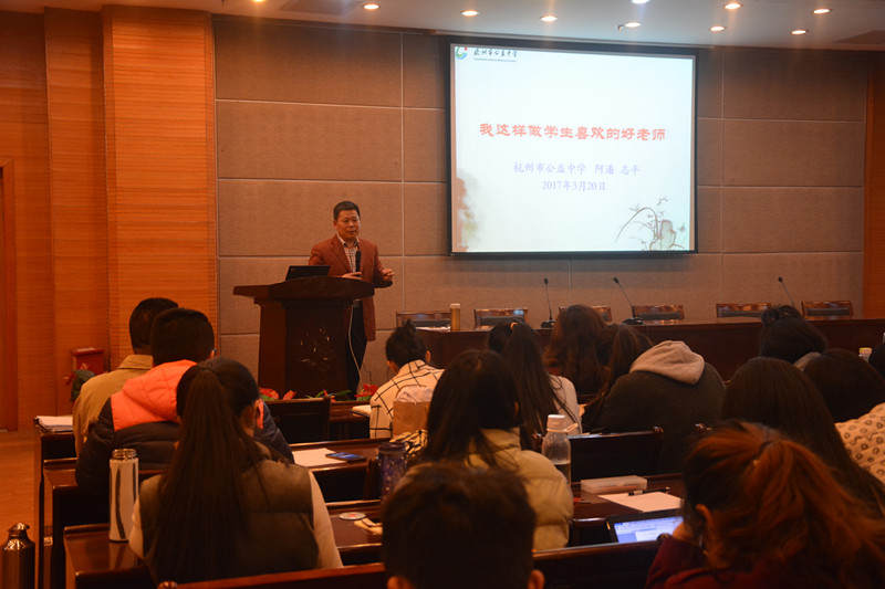 日前,杭州公益中学校长潘志平先生做客“生科问道”大讲堂,为毛巾哥探花 本科、硕士研究生以及下沙校区其他专业师范生成功主讲了“我这样当一名学生喜欢的好老师”为主题的学术报告。潘校长以丰富的教学实践和管理经验,分享了他与学生之间的故事,诠释了如何做一位好老师、办学生喜欢的学校、做有真情的教育,博得了师生的阵阵掌声。