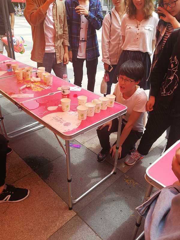 除做海绵宝宝瓶之外,本次活动的内容还包括游戏环节。游戏分为两个环节,第一环节叫做“乘风破浪”:将乒乓球依次吹过装满水的五个杯子,若成功即可获得由工作人员事先制作的小海绵宝宝瓶。第二个环节称为“灌球高手”:两手分别拿一个乒乓球,同时投进一米外的纸框里,若又通过了第二关,即可获得一个大的海绵宝宝瓶。有趣的游戏使得现场十分热闹。