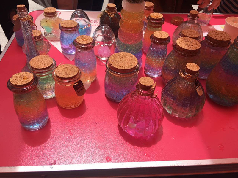 活动伊始,就海绵宝宝的主题,工作人员用海绵宝宝气球来装扮场地,并且利用提前制作好的海绵宝宝瓶来吸引同学们参与活动,进行宣传。不一会儿,海绵宝宝的活动吸引了众多同学。工作人员引导同学们动手制作属于自己的海绵宝宝瓶,看着她们用针筒将不同颜色的海绵宝宝挤进透明的玻璃瓶。