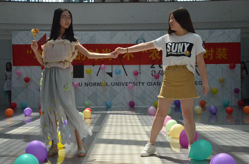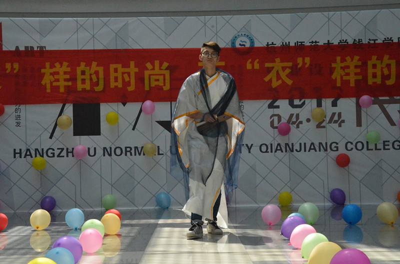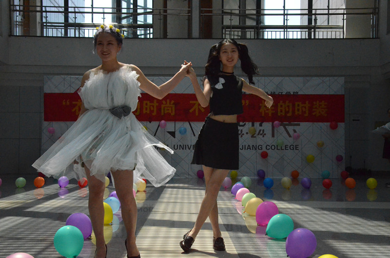 比赛开始,模特们用优雅的猫步、潇洒的转身生动的展示了设计作品。有用窗帘及蚊帐拼接的T恤和短裙,温婉可人而又不失性感;也有用黑色塑料袋及白色蚊帐缝制成的欧美风长裙,优雅动人如奥黛丽赫本,浪漫美丽如雅典娜女神。比赛高潮迭起,百花斗艳。其中食安161班奇思妙想,用宣纸及窗帘等制作了古装汉服,男模特身穿长袍飘逸霸气如王侯贵公子,女模特着粉色碎花长裙如端庄优雅的大家闺秀,宣扬了中国博大精深的传统文化。而环工161班则充分利用了军训的迷彩服裁剪成了迷彩短裙及短裤,令人眼前一亮。生技161的设计师依据模特自身的气质,用窗帘等设计出一黑一白两条短裙,如山间精灵,活泼灵动,轻逸飘渺,引得在场观众阵阵掌声。