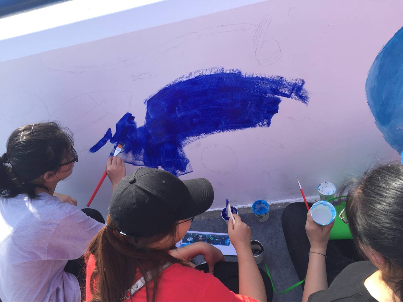 由于参加活动的一些小朋友们年龄还太小,不能独自完成一整幅图画,绘画志愿者们就主要负责为一些小朋友们做一些打底的工作,我们的志愿者们和小朋友们一起蹲在地上,顶着烈日在进行着绘画工作。底稿完成后,他们就帮助小朋友们上色。为他们领取颜料,再根据所分配的绘画内容,进行上色工作。志愿者们与小朋友们一起,天马行空,完成了一幅一幅五彩缤纷的图画。