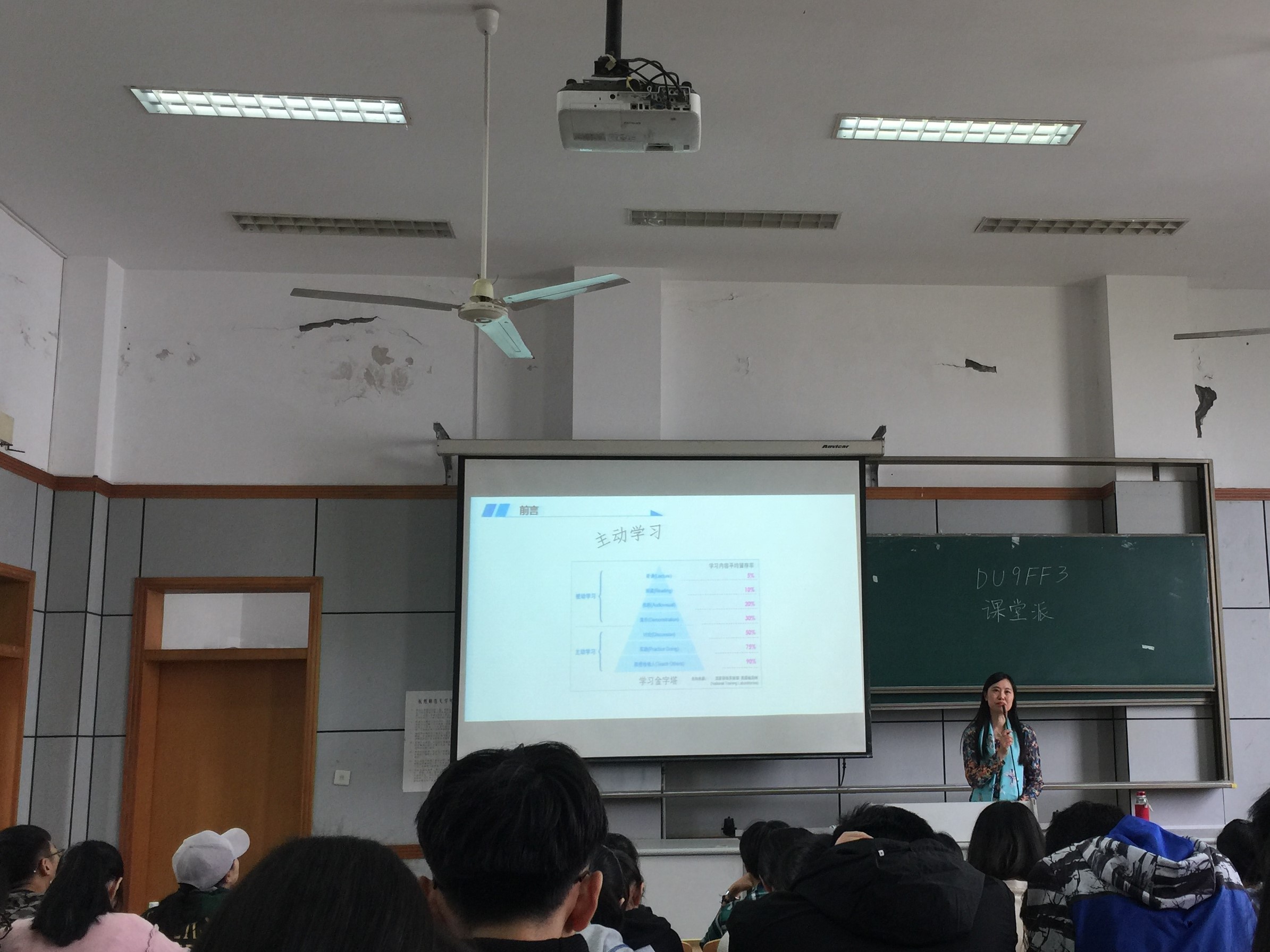 周老师先与同学们分享了一个关于动物办学的小故事,讲述了各有特长的动物们在学校全面发展的要求下学习自己并不擅长的东西,从而物极必反,导致他们的能力大不如前。周老师以此引出当今学校教学的弊端:培养学生德智体美劳全面发展的教育理念使得结果达不到预期目标。周老师紧接着以“互联网+”引出下一个话题——教育改革,周老师说:“学校不改变,我们就改变学校,于是网课就诞生了。”课程资源在网络上共享不仅仅提高了学生自主学习的能动性,还充分推动了教育改革的步伐。因此,渐渐地,课堂从以老师为主体,转变为以学生为主体,自古“学堂”二字的理解也从学生被动去上学,转变为主动去上学,于是,老师便成为学生学业历程上的脚手架,起到托扶、助力的作用。在此周老师以自身高中学英语为例子证明了这一 “学生为主,老师为辅”的观点并积极倡导以学定教、以学评教、以学助教的理念,进而引出学习金字塔,其中主动学习占金字塔底层主要部分,其清晰明了的图示给了在座每位同学极大的启发。随后,周老师以与我们2017届学生密切相关的七选三为例讲述了浙江省课程改革的历程,其中着重讲述了生物的课程改革,提倡将新型的生物教学模式融入到我们的专业课中。在讲座渐渐接近尾声时,周老师对当下的生物教学提出了四点建设性意见,即按需配比生物学科教师、加强学科课程方案建设、合理规划教学设置、加强生物学科组建设。