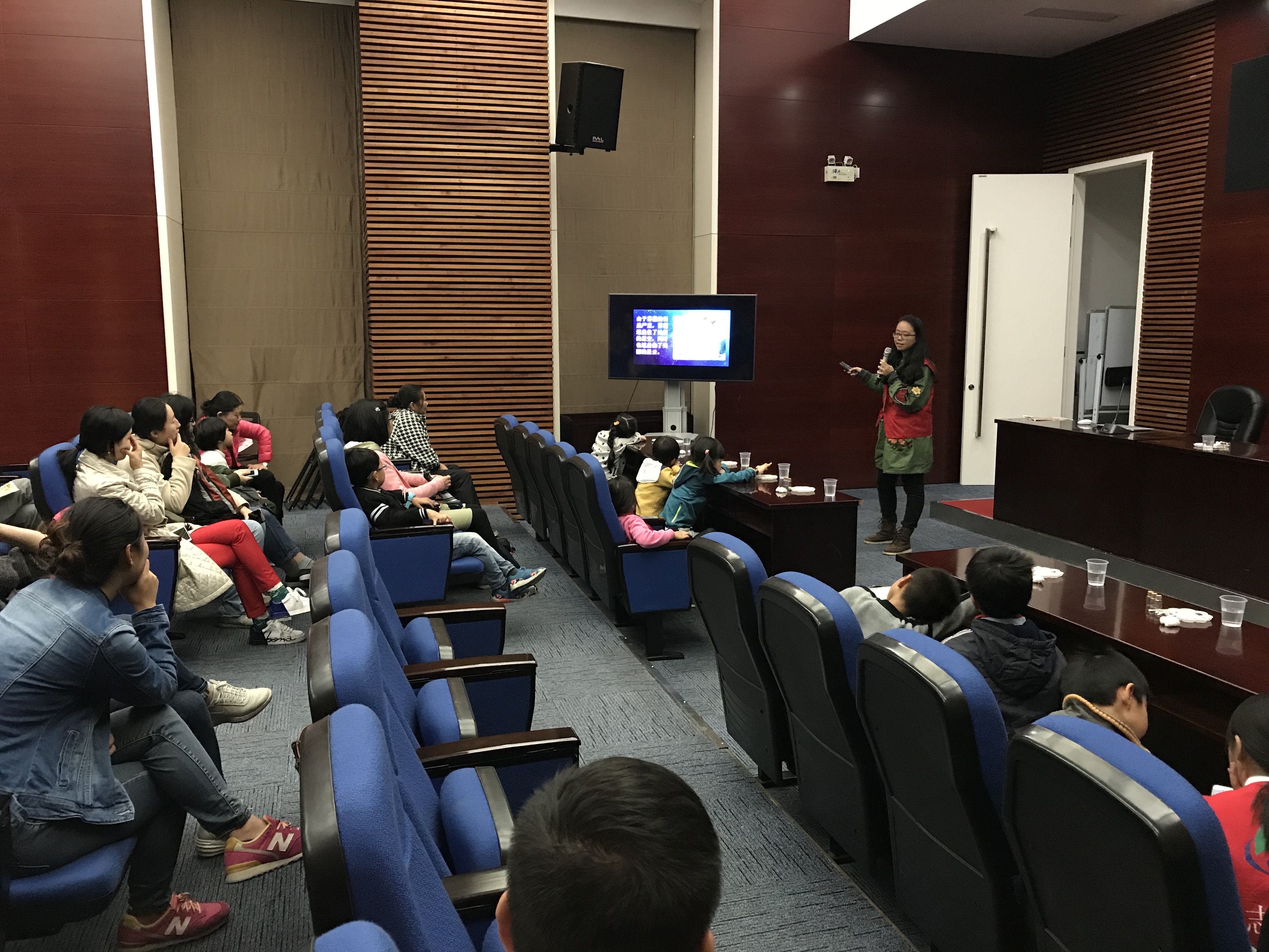 活动开始之前,许多对星云瓶制作有兴趣的小朋友听到广播中的相关的活动预告后,便来到服务台报名,随后,他们在志愿者的引领下前往活动的场所——四楼科普教室。在教室里,面对调色板里五颜六色的颜料,小朋友们兴奋不已,拿着空瓶子跃跃欲试,一时之间教室里热火朝天。但当工作人员要播放开场视频时大家都立刻安静下来,并将目光投向大屏幕,对着视频中多姿多彩的星云感叹不已。开场视频结束,工作人员开始解说PPT,小朋友们都调整坐姿、挺直腰板认真的的听解说员解说。