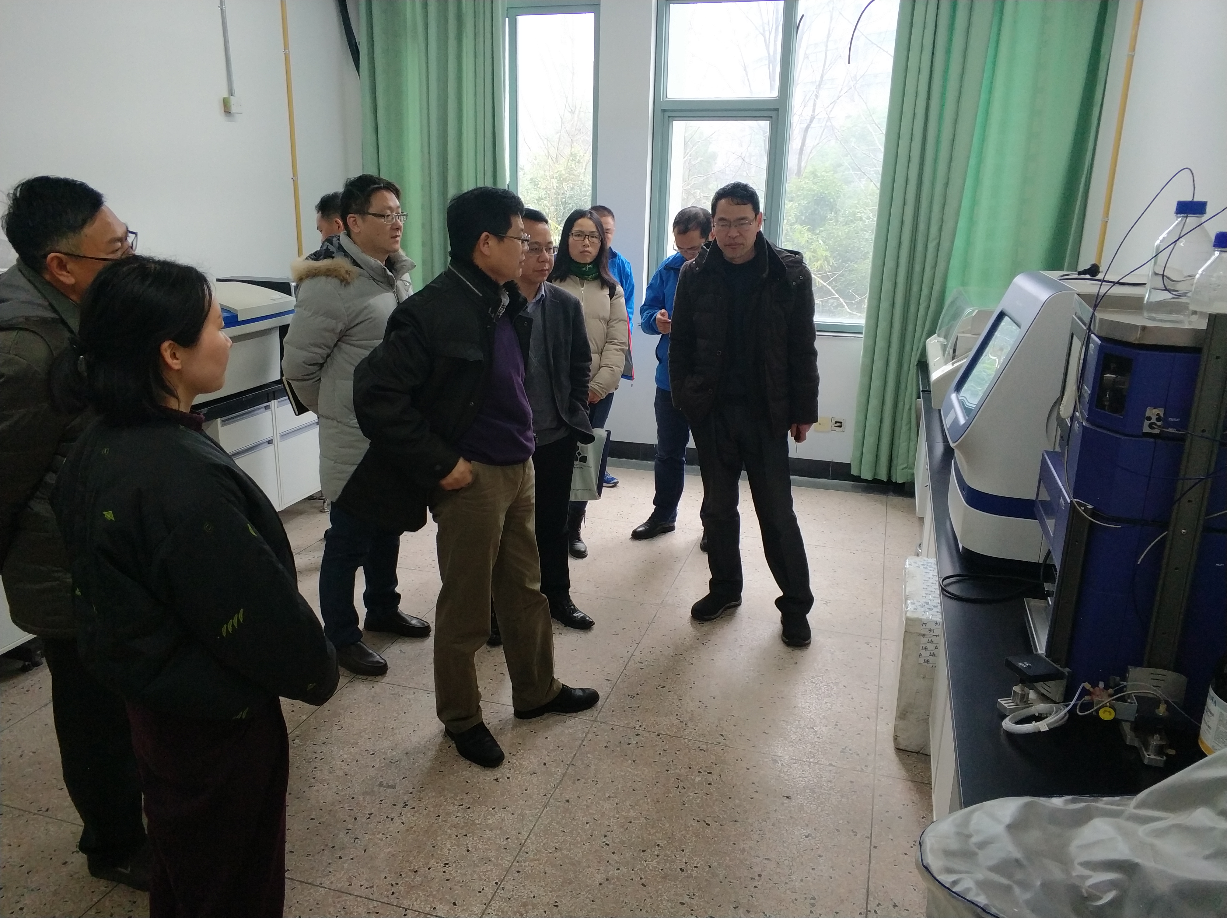 近日,杨磊副校长在实验建设管理处处长赵飞、副处长凌明路等人员的陪同下,到毛巾哥探花 检查实验室安全工作情况,毛巾哥探花 院长王慧中、副院长于彦春等人陪同检查。杨磊副校长一行检查了1号和5号实验楼危化品室、公共大型仪器平台和各课题组的科研实验室、教学实验室,并详细询问了大仪平台的使用效率,期间对实验技术员的一些诉求表示关心。