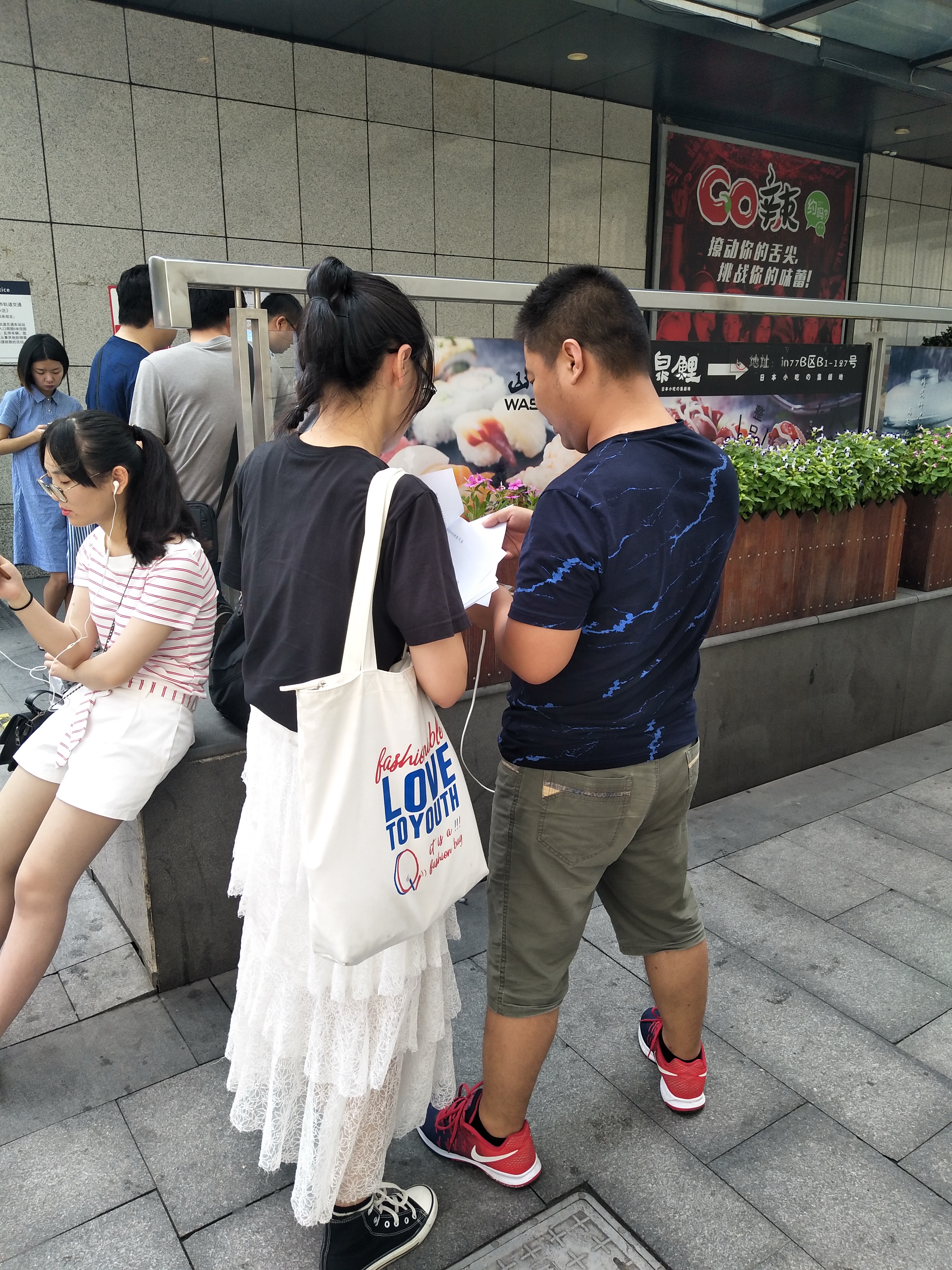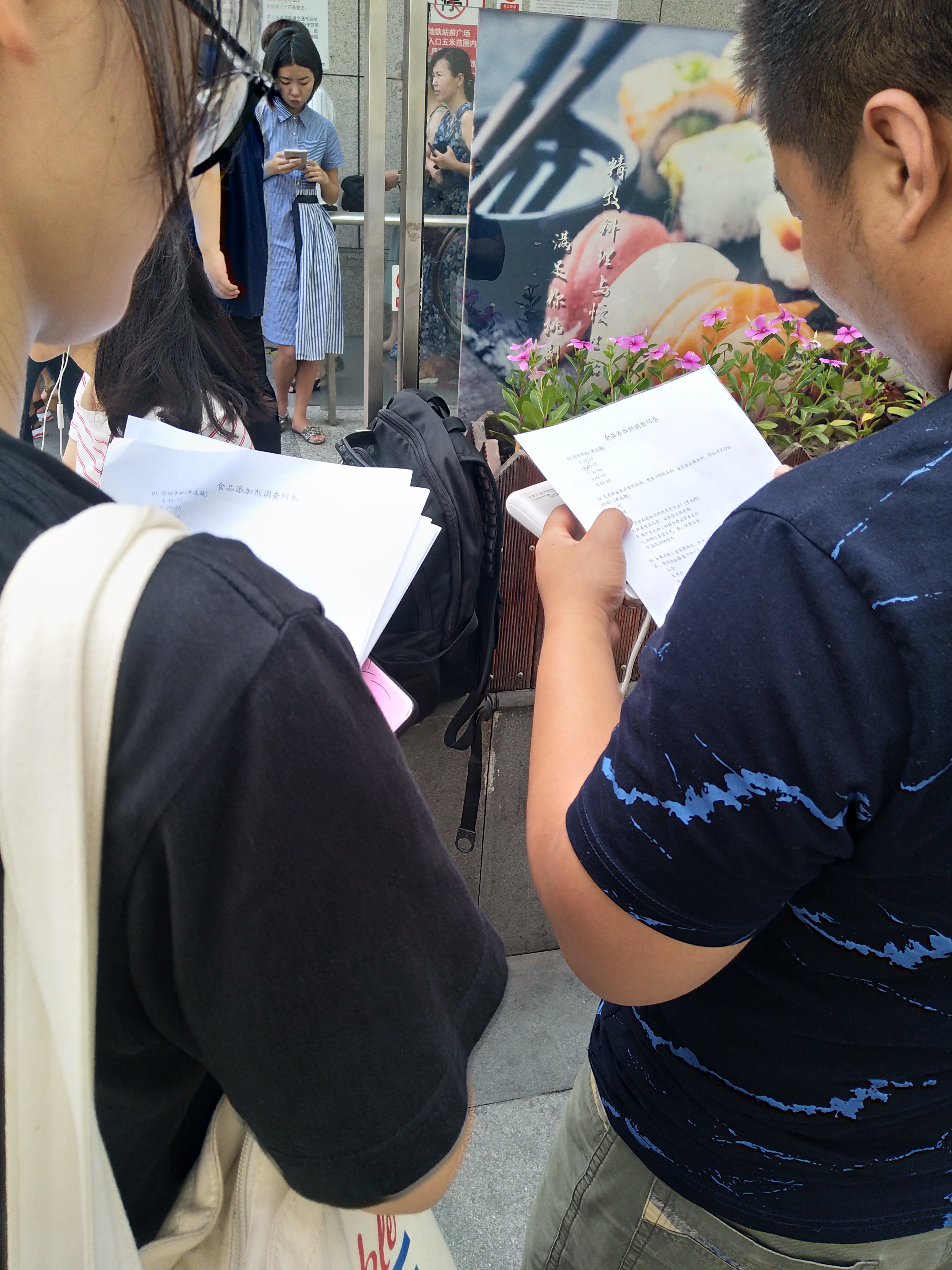 队员们在地铁站集合,沿路发放问卷。两人一队,一人发放调查问卷时另一人负责拍摄记录。在制作调查问卷时,第一题就是受访对象的年龄段,这能更好地体现出调查数据的多样性。调查过程并不是一帆风顺的,经常会有碰一鼻子灰的时候。有时候匆忙赶路的人们并不愿意停下来慢慢思考填写两页A4纸的题目,但是因为队员们的热情与努力,以及分工合作的高效率,小分队还是在短时间内完成了手头的问卷调查任务。