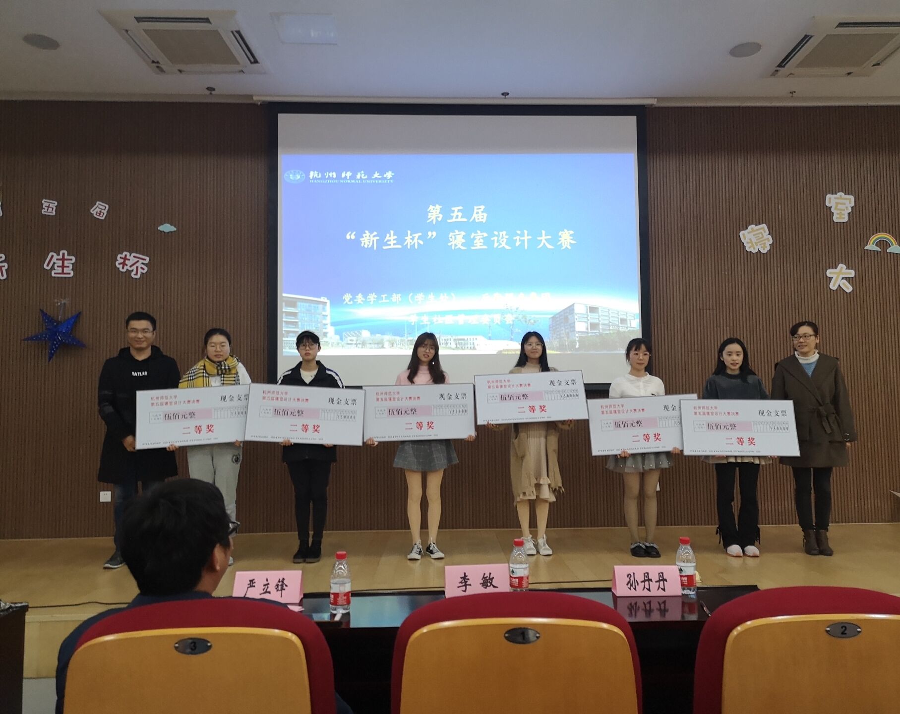 出席此次寝室设计大赛决赛的有后勤服务集团公寓中心副经理严立峰老师、后勤服务集团公寓李敏老师、孙丹丹老师、校学工部张伟闯老师以及社管委副主任应婷妃学姐。首先由寝室代表们上台进行限时五分钟的答辩以及ppt展示,通过精美的ppt、图片、视频等各式各样的方式,将每个寝室的设计特色、寝室文化以及寝室日常展现给老师、同学们,让大家都能感受到每个寝室像家一样的温暖。通过激烈的角逐,最终产生了一等奖三名,二等奖六名,三等奖八名,其中生科院的4-244寝室与4-218寝室分别以第五名、第六名获得二等奖的荣誉。