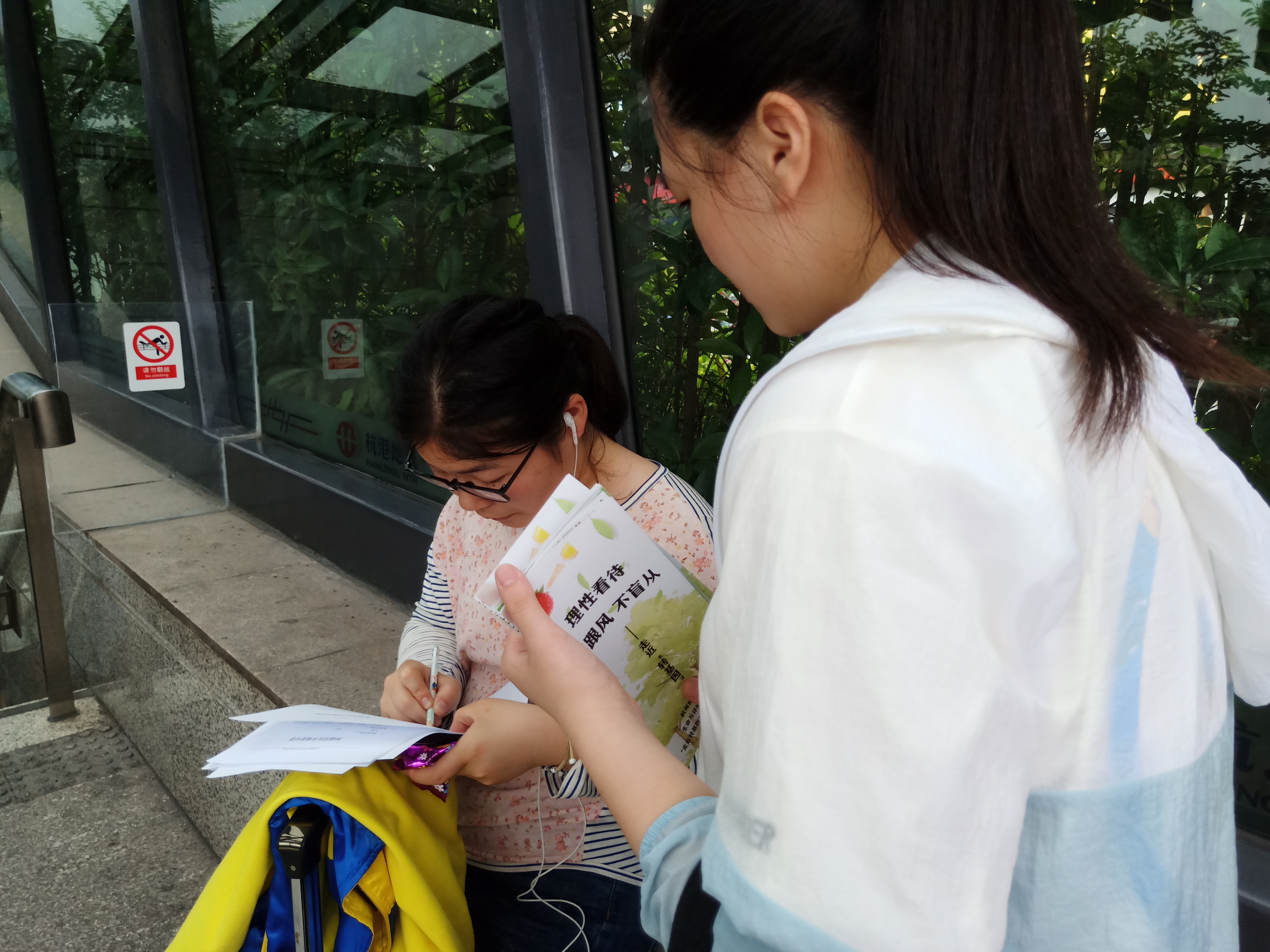 除去留在社区的这部分人,剩余的成员,分为两人一组到周边地区进行宣传科普。据了解月雅苑社区处于繁华地段,周围有商场,学校等,人群流量大,这也为“走近转基因”小队科普活动的开展增添了一份力。一部分成员在路上向过往行人分发问卷调查,进行街头采访,讲解转基因知识。另一部分成员则是走访了周边科教园区,向在校师生进行科普。大约十一点左右,各小组调查问卷分发完毕,成员回到月雅苑社区集合,进行拍照留念。