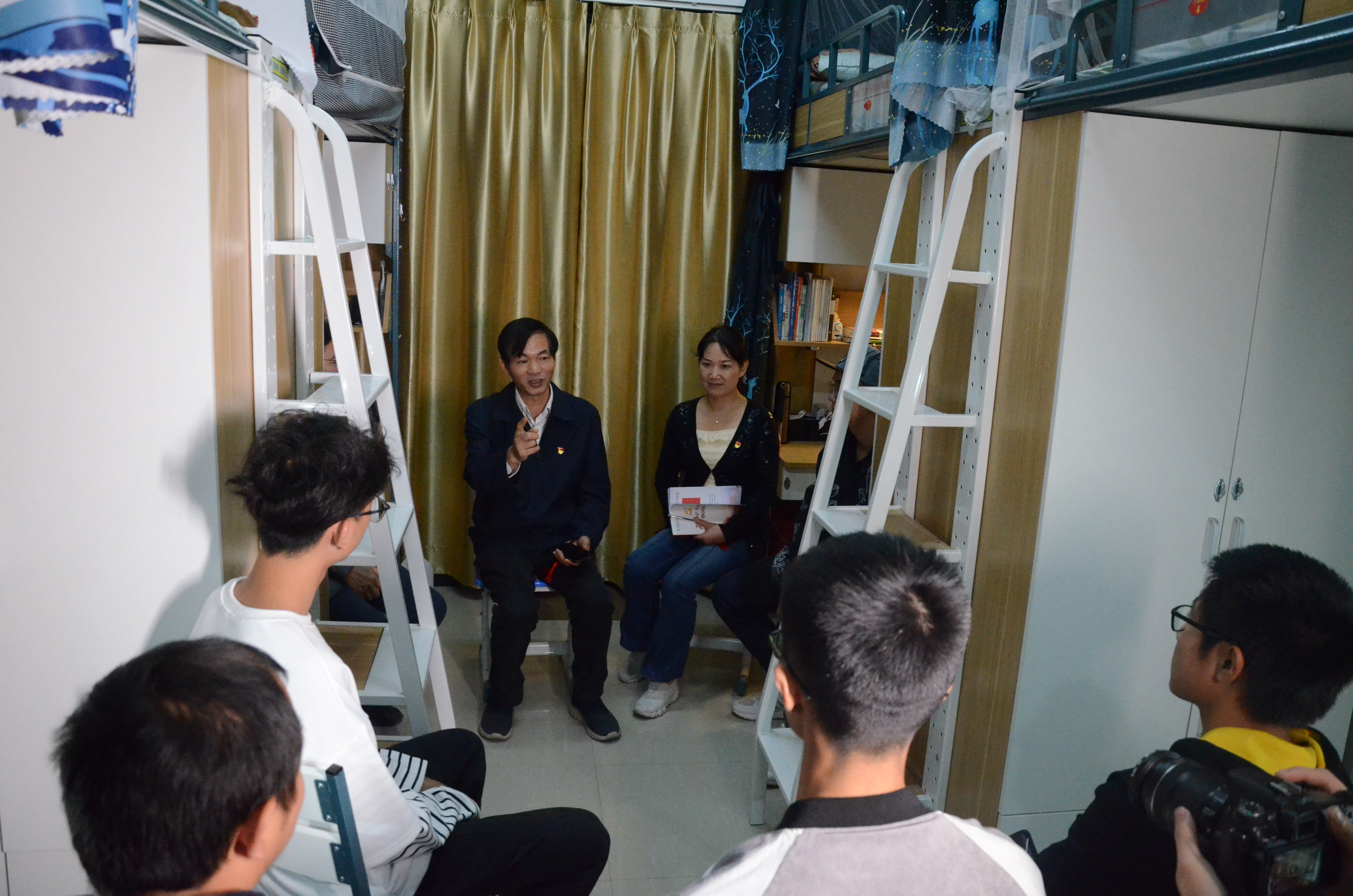 在进学苑5-316时,陈永富副校长和在场的女生表示,除了知识底蕴,女孩子最重要的是要有自己的气质和气场,鼓励同学们要多多参与志愿者活动,提高自身素养,让自己的言谈举止更加的得体,从而成为更好的自己。而和进学苑4-313的男生座谈时,陈永富副校长提出男孩子要更加的勇敢,要有报国的斗志和雄心。