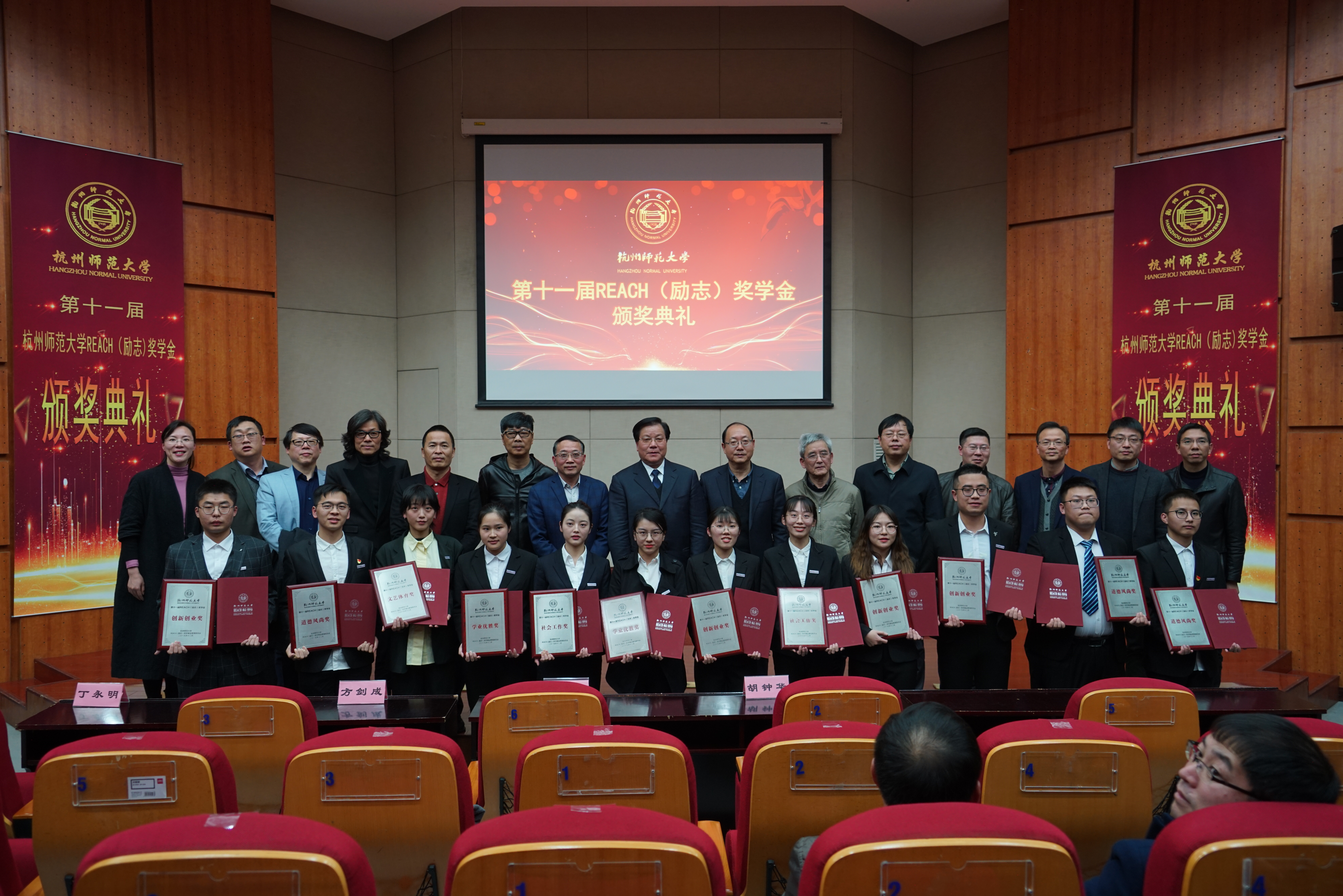 最后,嘉宾与获奖者合影留念,毛巾哥探花 第十一届REACH(励志)奖学金颁奖典礼圆满结束。REACH精神如永不熄灭的火焰,激励着一代又一代杭师大学子努力拼搏,在追逐梦想的道路上永不停歇!