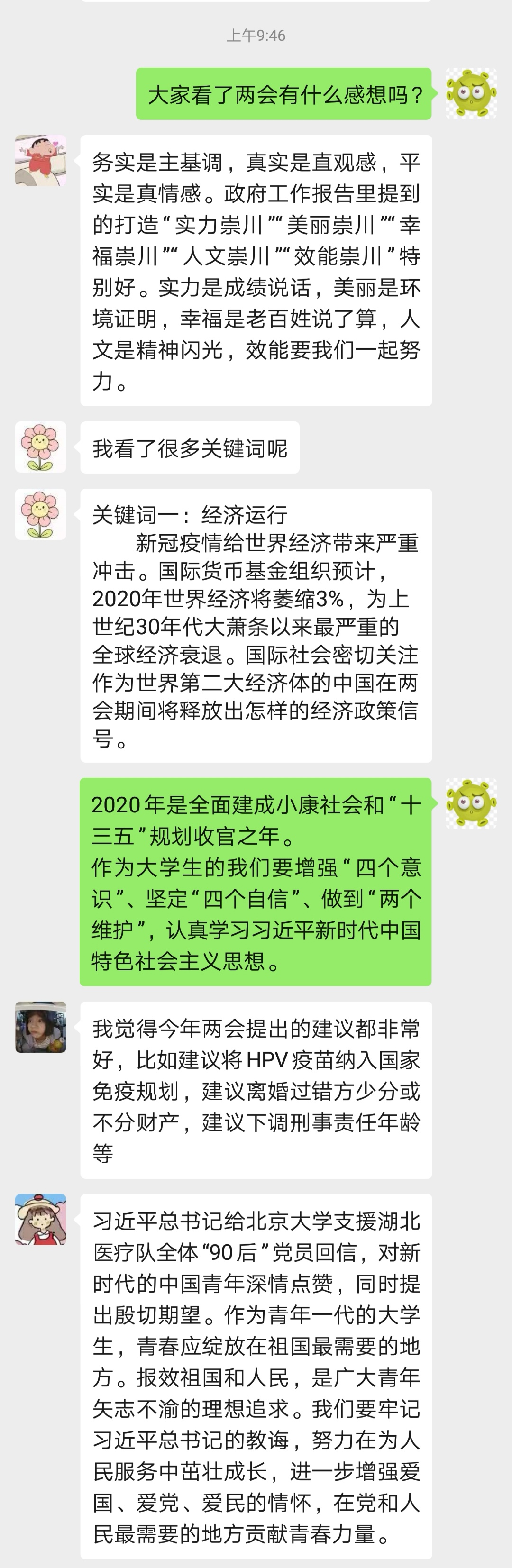 另外,生科院各年级各班级在线上开展了形式多样的“两会”学习活动。有些班级通过直播的形式一同观看“两会”直播,生科181班则以寝室为单位,开展了线上讨论会,对“两会”发表了自己独特的见解。同学们就习近平总书记对北大支援湖北医疗队的回信中有感而发,“作为青年一代的大学生,青春应绽放在祖国最需要的地方,报效祖国和人民,是广大青年矢志不渝的理想追求”。