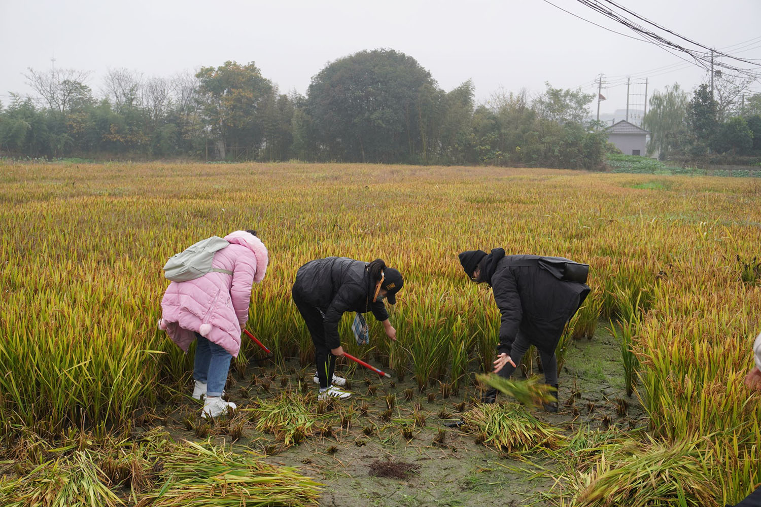 下午1点半,在生命环境科学学院辅导员吕京京老师和孙碧霞老师带领下,21名大一新生一同乘车前往位于高桥村的生科院大学生劳动教育基地进行稻田收割。即使寒风刺骨、阴雨绵绵,但同学们企盼的心情丝毫没受影响。