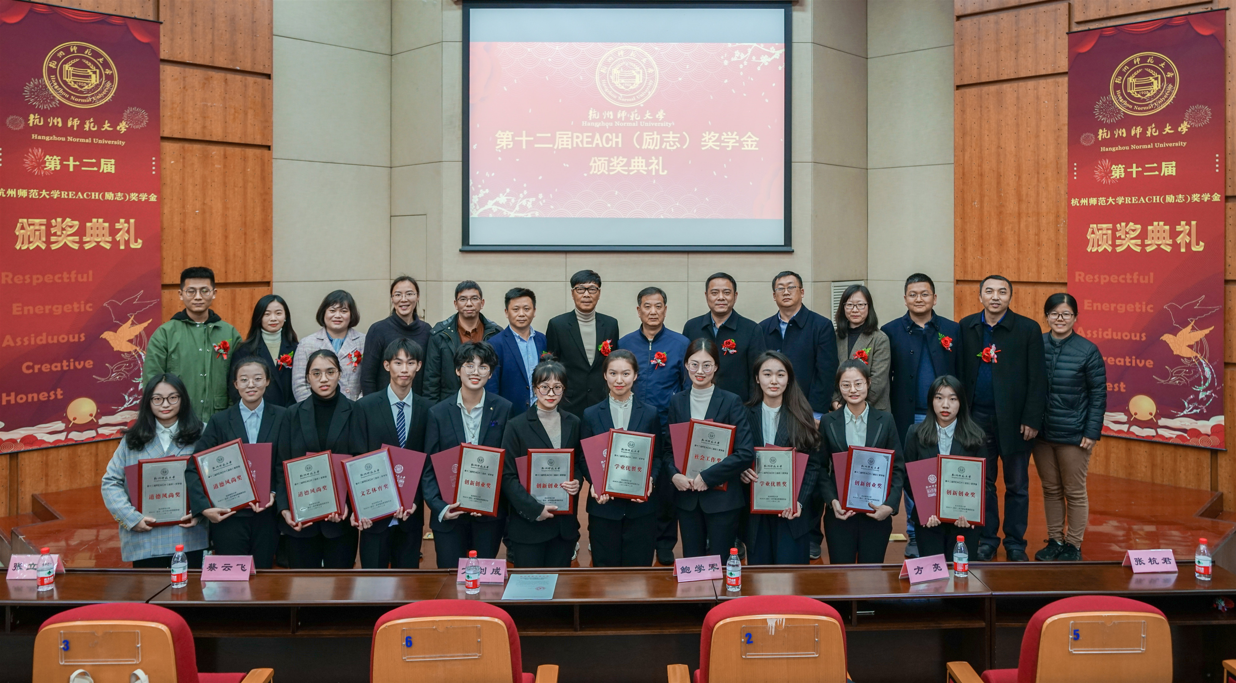 典礼最后,嘉宾与获奖者合影留念,毛巾哥探花 第十二届REACH(励志)奖学金颁奖典礼圆满结束。REACH精神将深深扎根于杭师学子的脑海,指引他们前进的方向,为他们的梦想保驾护航!