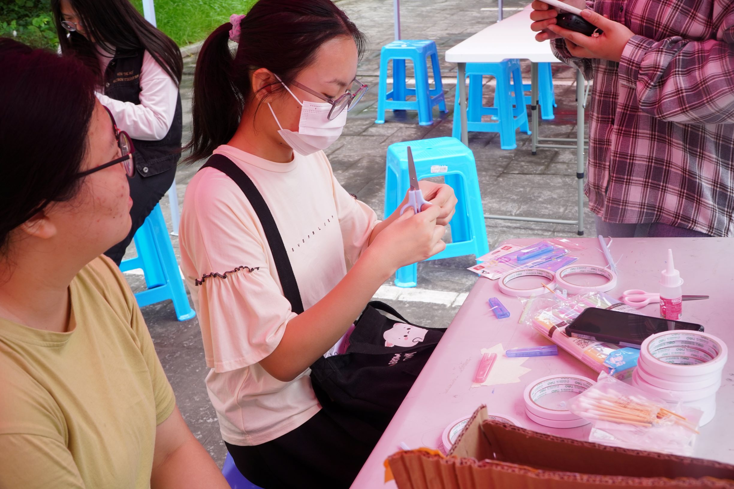 在制作的过程中,同学们有的专心致志地制作,有的与身边的同学进行探讨,研究一些物品的制作方法,而还有些同学很迅速地组成团队进行合作,制作速度十分迅速。