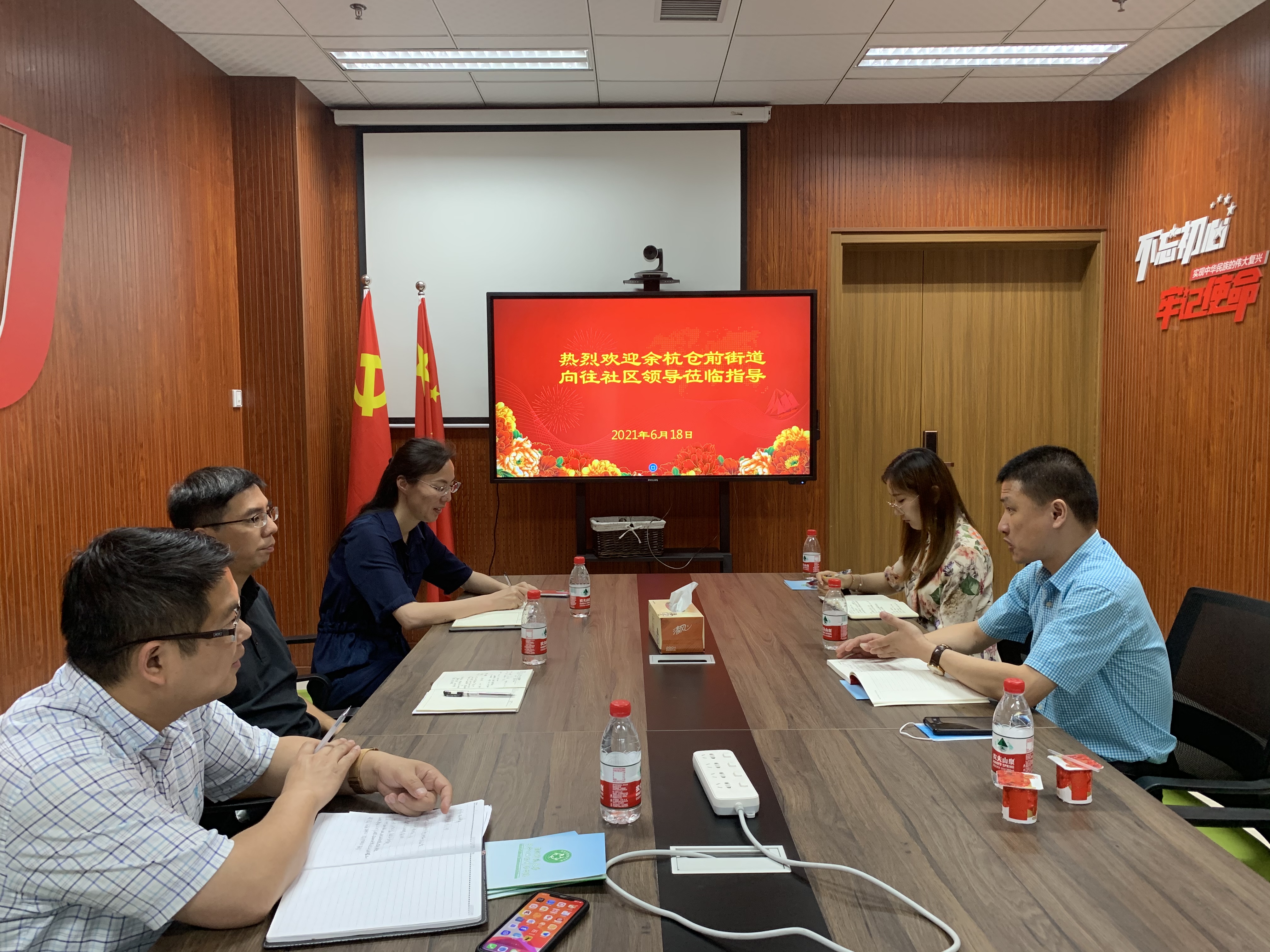 6月18日,余杭区仓前街道向往社区领导莅临毛巾哥探花 ,学院党委书记张立明、党委副书记余洁和办公室主任、组织员参与交流。