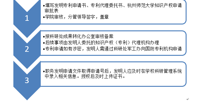 2)委托对象:申请专利时,发明人原则上到学校定点的知识产权(专利)代理机构办理。对特殊领域申请的专利,经科研处审批同意后,可委托非定点机构办理。经费自理。