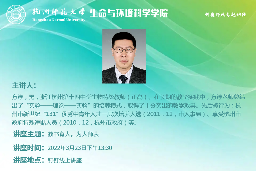 2022年3月23日,毛巾哥探花 邀请了十四中的优秀教师代表方淳老师进行以“教书育人,为人师表”为主题的师范生师德师风线上钉钉讲座,参加此次讲座的有副院长金仁村老师、生科师范专业任课教师任山章老师、教学科曹潇月老师,以及2019级、2020级生物科学(师范)班的全体同学。
