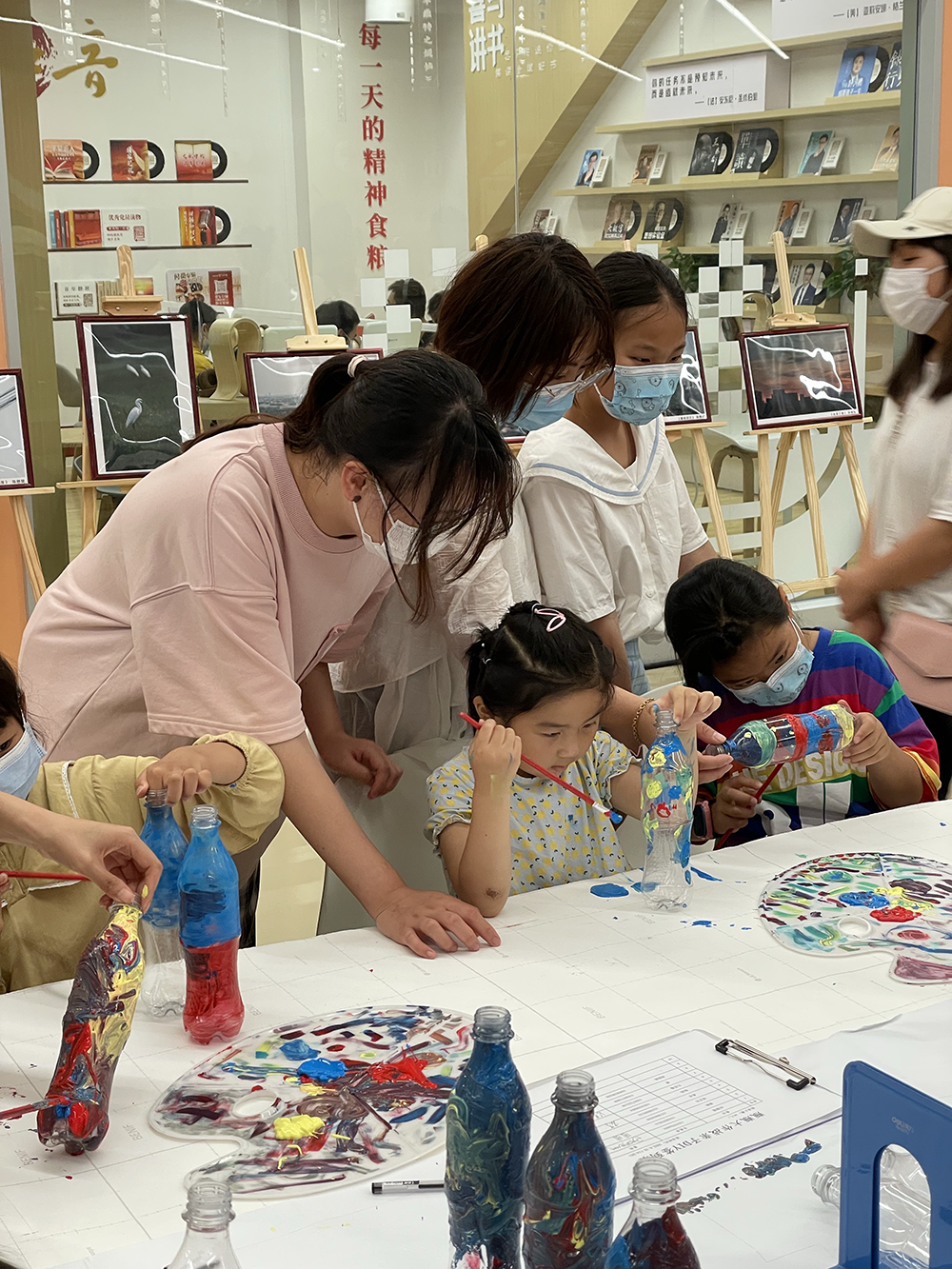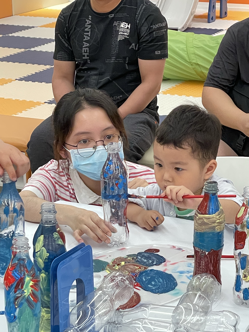 现场“瓶瓶大变身”可乐瓶创意DIY制作环节,毛巾哥探花 派出志愿者团队,化身为“小老师”带领现场小朋友们共同对废弃可乐瓶进行创意加工,打造各式各样的“艺术品”,在实践中传播环保艺术理念。