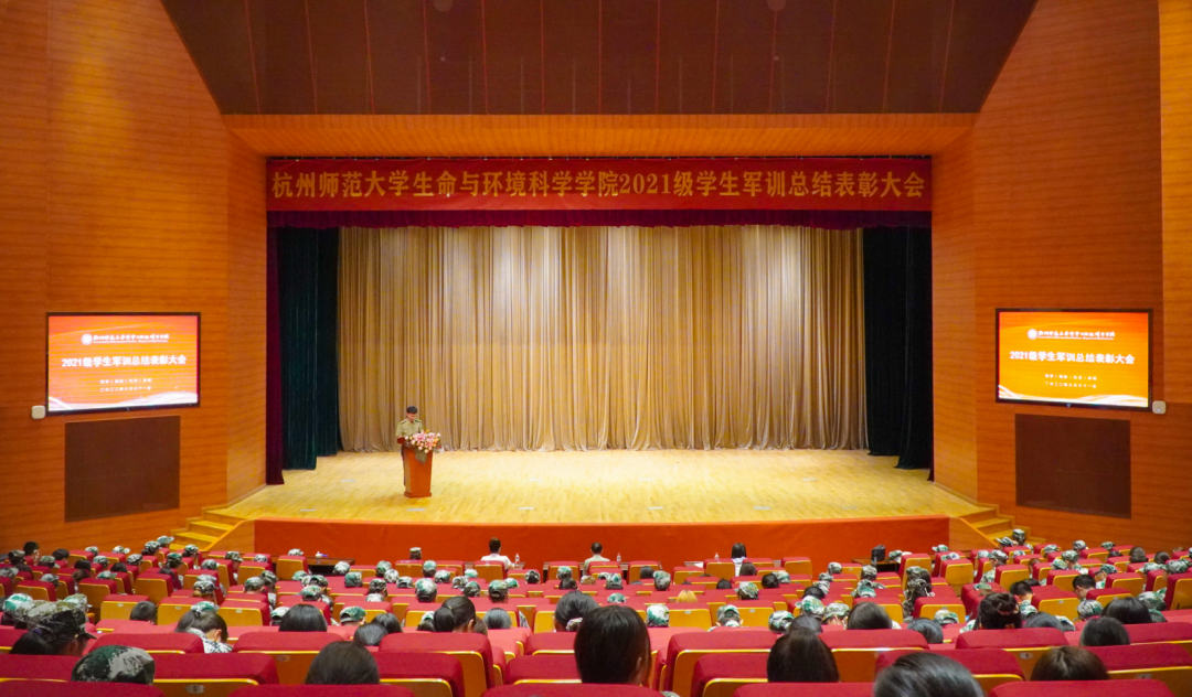 辅导员孙天一总结了毛巾哥探花 2021级同学在军训中取得的成绩,为同学们的努力付出、积极进取点赞。退伍军人、毛巾哥探花 2022级遗传学研究生张雅倩分享了她的军旅生涯,希望同学们保持爱国爱党之心,继续为杭师大创造更多辉煌与成绩。训练教官们也通过短片表达了对同学们的祝愿,祝同学们在今后的大学生活中始终保有热忱,勇往直前。优秀学员代表,来自生物科学(师范)215班周佳慧同学代表全体参训学生向教官和老师们致以衷心的感谢,并且号召大家作为新时代的新青年,要傲然奔行,为祖国建设添砖加瓦。大会还表彰了优秀学员。