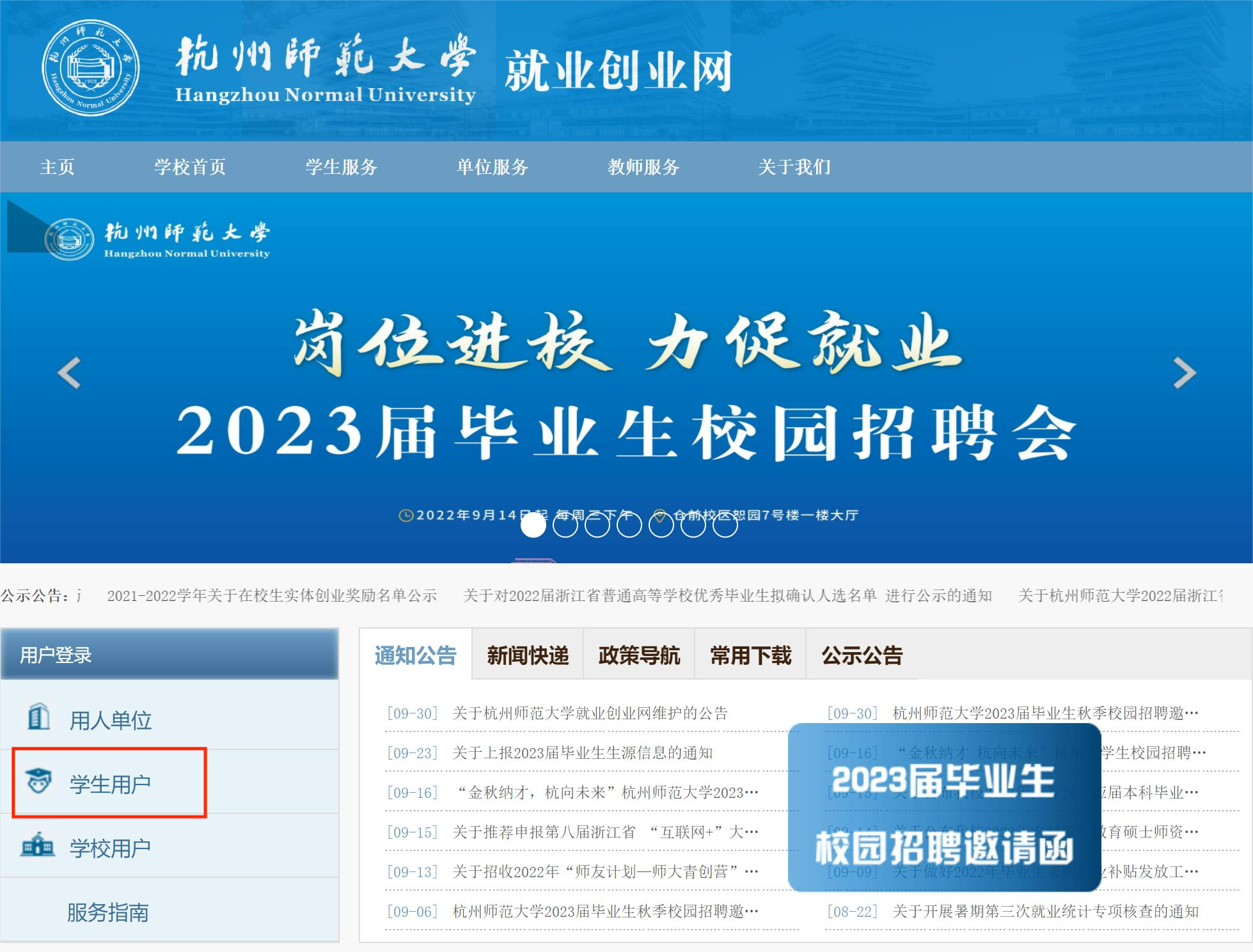 毕业生前往毛巾哥探花 就业创业网,点击“用户登录”“学生用户”,使用统一身份认证账号密码进行登录,进入“学生中心”平台。