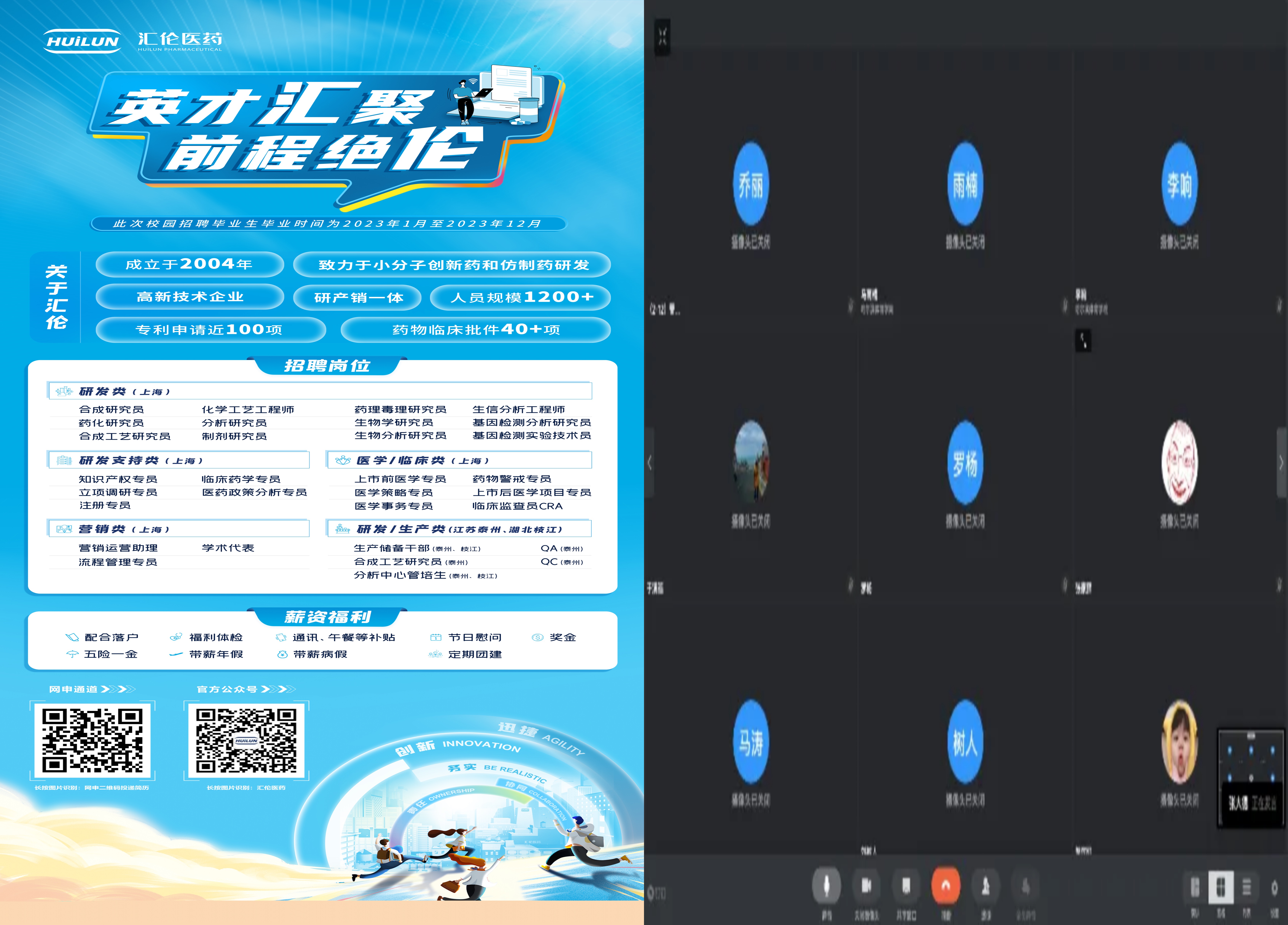 汇伦医药是成立于2004年的一家致力于小分子创新药和仿制药研发且研产销一体的高新技术企业。宣讲人详细介绍了此次招聘的五大类岗位,分别是研发类、研发支持类、医学/临床类、营销类和研发/生产类。此外,他还指出企业具体的薪资福利,提供了官方公众号让有意者了解更多,同时提供网申二维码用以投递简历。