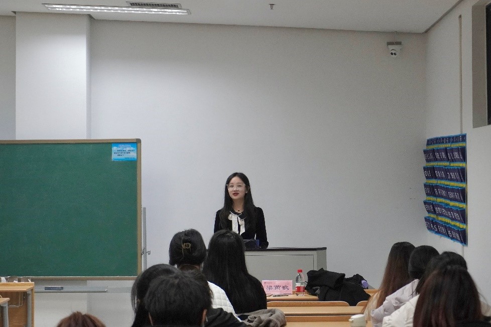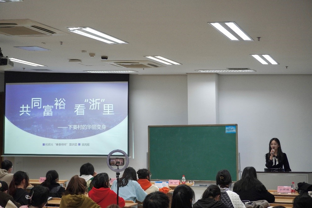 校“青春榜样”宣讲团成员、哈尔科夫学院梁芮歌同学作了主题为“以青春之我,赓续革命精神”和“共同富裕看‘浙’里——下姜村的华丽变身”的宣讲。梁芮歌的外曾祖父是老一辈共产党员,这让她对革命精神有了更深刻的感悟。结合党史故事、党的二十大精神和自身经历,梁芮歌在宣讲中号召同学们一起争做坚定理想信念、赓续红色血脉、传承革命信仰的时代好青年,并希望大家能够在学成之后回报家乡、回报社会。
