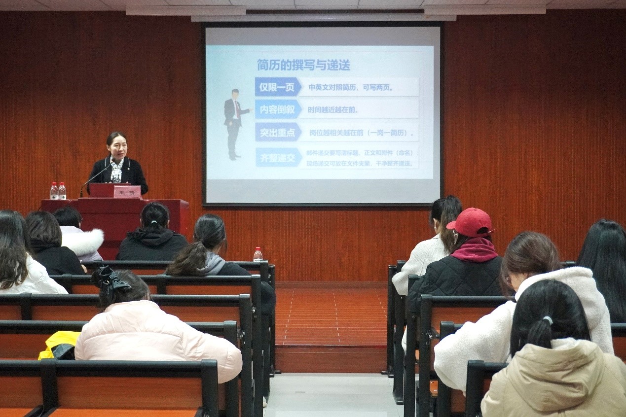 本次讲座面向全院本科生、研究生毕业生开展。王倩副书记从确定目标、投递简历、接收通知、现场面试、反馈感谢等五个方面针对毕业生的复试、求职流程和礼仪形象作了详细解说和演示,并对需要注意的事项作了特别提醒。她指出,扎实的专业知识和技能是面试成功的基础,需要提早做好充分准备,得体大方的礼仪形象和良好的行为规范是个人修养的体现,是面试的加分项,也需关注。