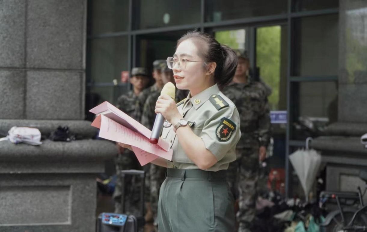 辅导员谭椰介绍了本次军训的总体情况,并针对军训期间相关注意事项进行了说明。全体承训教官向现场同学们依次作自我介绍,并表明圆满完成本次军训任务的信心。
