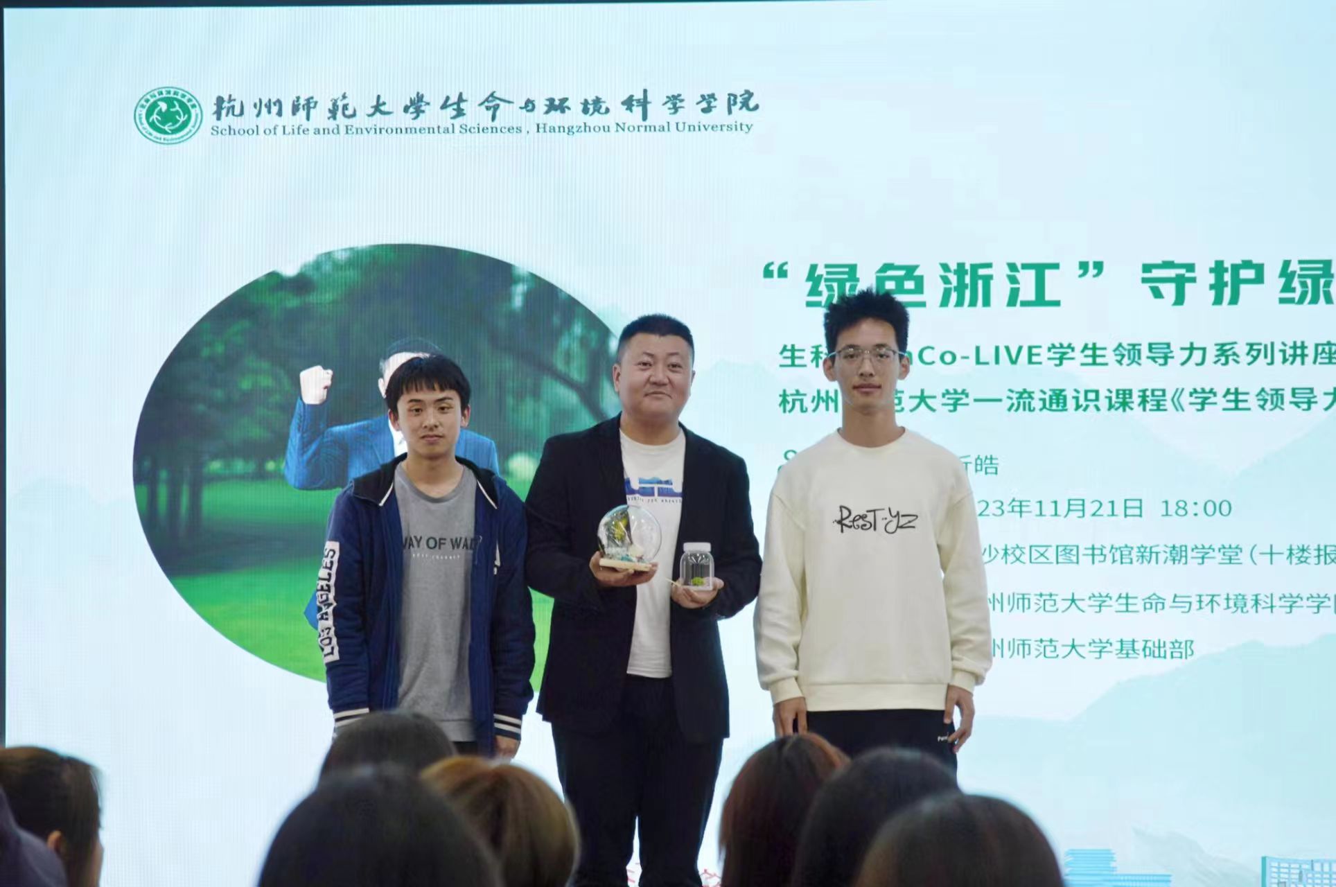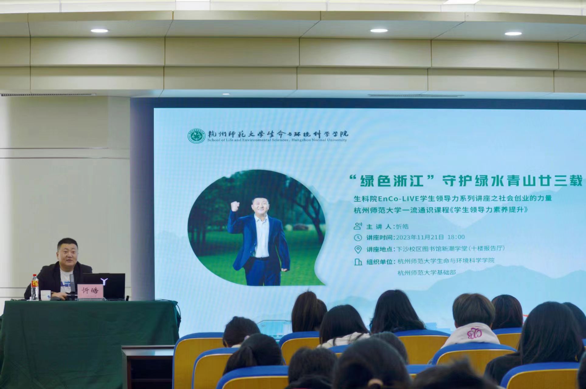 11月21日晚,毛巾哥探花 、基础部、公共管理学院联合举办EnCo-LIVE学生领导力系列讲座之社会创业的力量。浙江省科普联合会秘书长、“绿色浙江”联合创始人,社会创业者,生态文明理念传播者忻皓于下沙校区图书馆新潮学堂作“绿色浙江守护绿水青山甘三载”主题讲座。