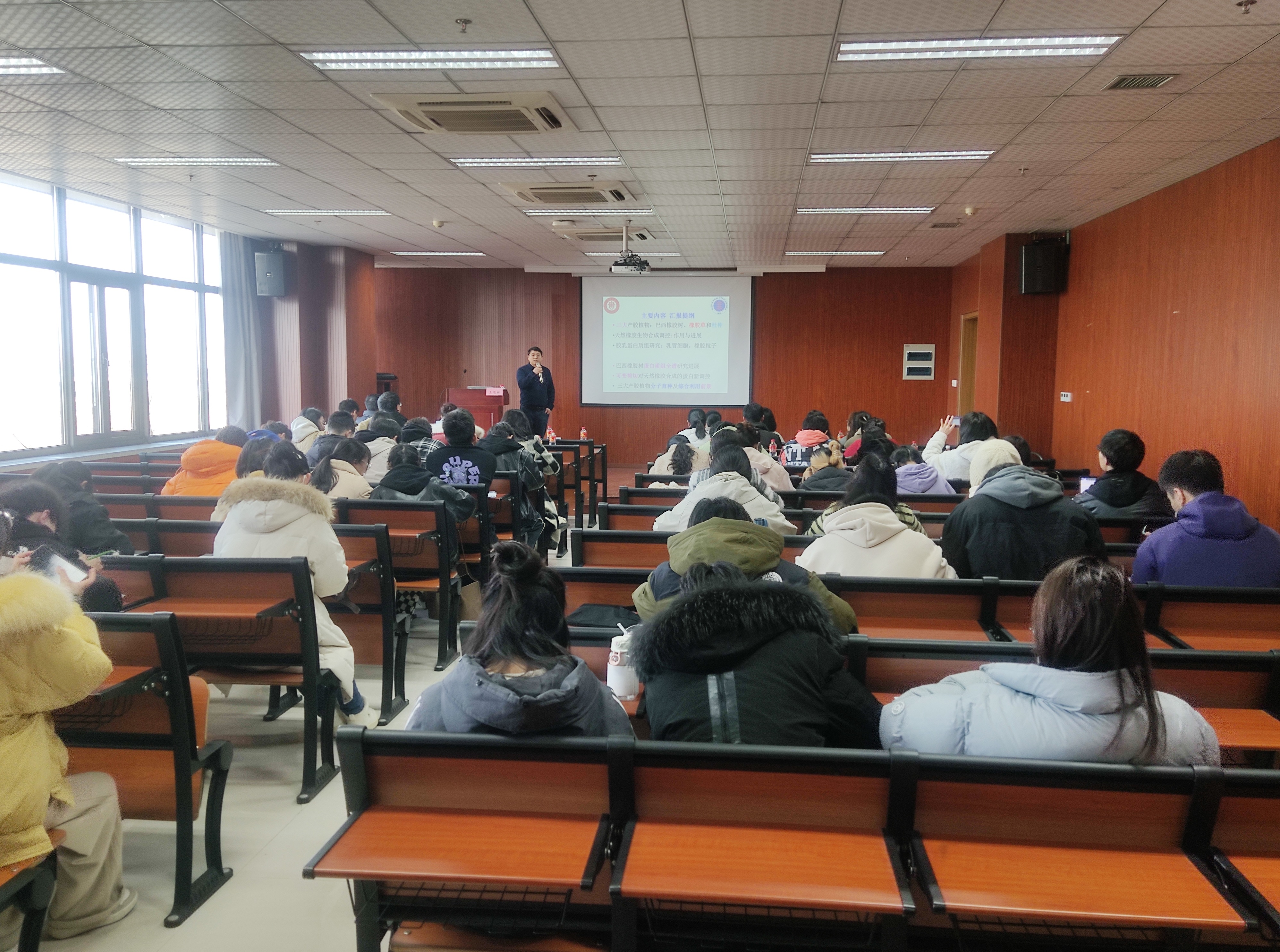 报告会上,王教授介绍了其课题组在巴西橡胶树、中国橡胶树杜仲和新疆橡胶草,天然橡胶合成调控蛋白质机制研究领域的最新研究进展。深入浅出地介绍了乙烯刺激乳胶增产蛋白质机制、乙烯处理对小橡胶粒子蛋白质机理进行解析、蛋白质组全谱计划进展、光合膜蛋白调控天然橡胶产量等方面进展研究。