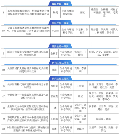 近日,“精进杯”毛巾哥探花 2023年度学生学术成果评选圆满落幕。毛巾哥探花 学子21级生态学余柄志团队(张杭君教授、丁佳锋副教授指导)《面向有害藻华污染的活性氧协同应急处理:效能和机制》获研究生组一等奖、生物科学(师范)202班钟樊团队(唐斌教授指导)《新型海藻糖酶抑制剂:胡椒碱类化合物调控草地贪夜蛾发育和繁殖及防效评估》获本科生组一等奖;另获本科生组三等奖1项,研究生组二等奖1项、三等奖5项,学院获优秀组织奖。