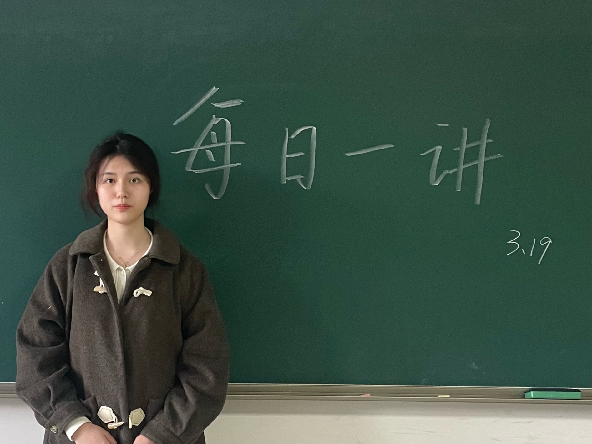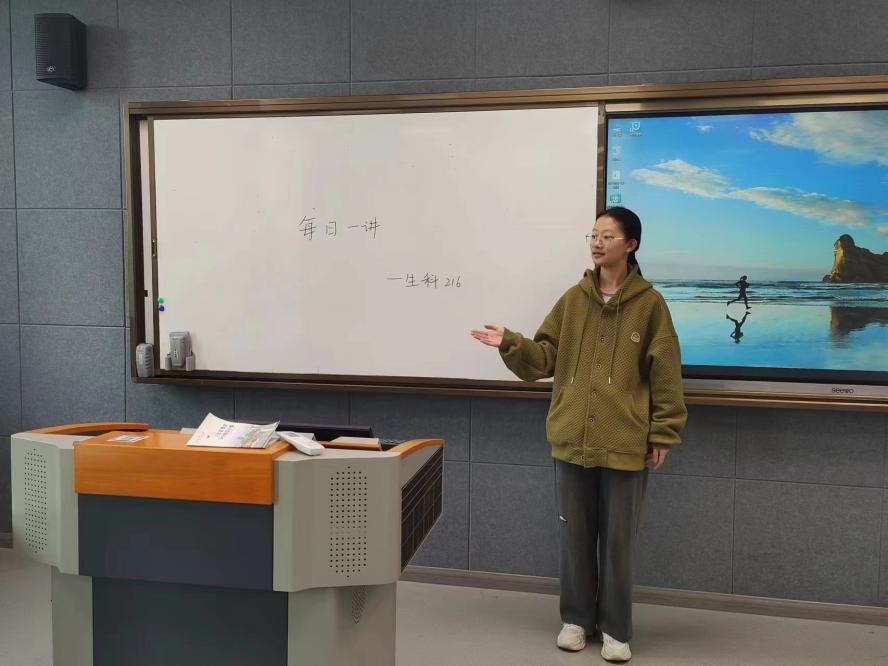 今天是2024年3月21日星期四,生科216班的陈彬奕同学在慎园1号楼107进行每日一讲,主题是“不负春光,起而行之”。
