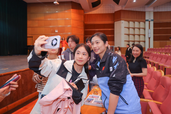 在现场提问中,同学们纷纷举手,现场互动频繁,反响热烈。王琳为提出羽毛球运动专业问题的同学们提供了现场指导,并做了演示,鼓励同学们多练习,并找到适合自己的方法,适合自己的是最好的。她坦诚地向同学们分享了自己成长中曾经遇到过的困惑、碰壁的困境和走过的弯路,认为每次走下领奖台就要从零开始,要坚持不懈、永不言败,突破自我,虽败犹荣。她介绍了遇到不利比赛环境时自己常用的“有利思维法”,帮助同学们在面对逆境时调整心态,肯定了坚持打球但无法成为职业运动员、自称普通大学生的同学,鼓励他“坚持打球,你不普通”,认为每个追寻梦想的人都不普通。她希望同学们能够与最大的对手——自己和解,做好自己可控的事情,如同新木桶效应一样,用好自己的优势,同时有梦想,有格局,有良好心态,她说:“本是平常人,保持平常心”,希望同学们接纳自己、活在当下,并永远期待未来。
