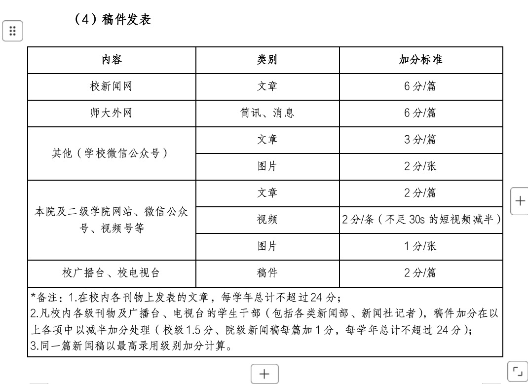 2.凡校内各级刊物及广播台、电视台的学生干部(包括各类新闻部、新闻社记者),稿件加分在以上各项中以减半加分处理(校级1.5分、院级新闻稿每篇加1分,每学年总计不超过24分)。