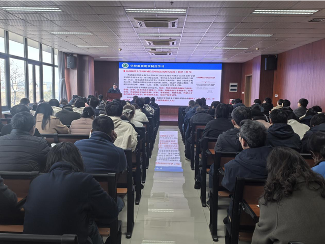 江齐里介绍了学院新引进的教师,并从综合治理、师德师风、意识形态、保密教育、育人教育、党风廉政、实验室安全等七大方面进行了工作部署。院长薛大伟与教职工一起学习了科研诚信、科技成果转化、横向经费管理等学校重要文件,并从2026年国家自然科学基金申报、学科建设、人才引育、学生就业、教学工作、学校“12350”行动等方面进行期末工作部署。
